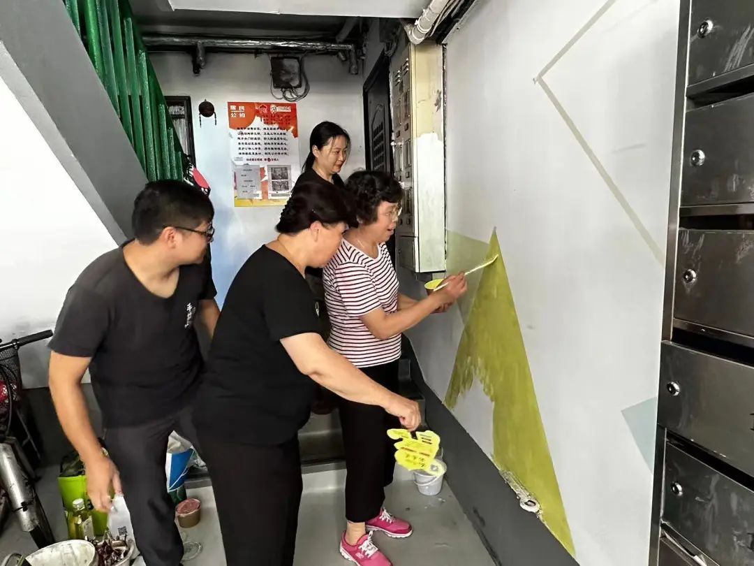 在楼道彩绘中,还有一支参与力量便是楼组的居民朋友们和居委社工们,居委干部们用心收集居民诉求,挖掘社区志愿力量参与楼道彩绘,大家在“一笔一划”中深刻感受社区里一点一滴的变化,也在相互交流中增进了邻里情。