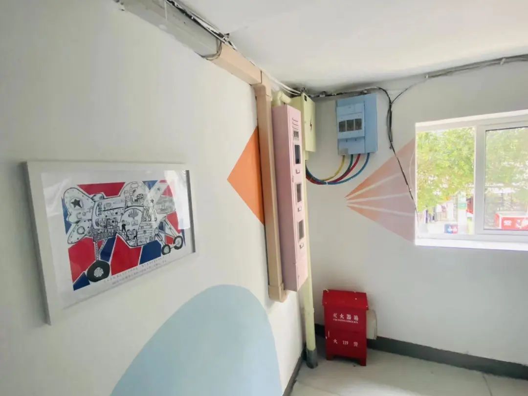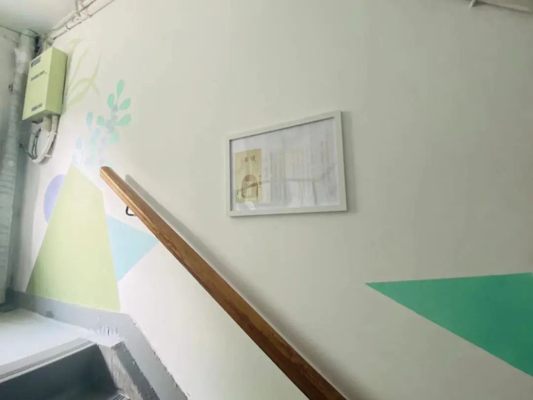 走进学院小区68、70号楼道内,“多巴胺”的色调迎面扑来,不同着色的图案相互交织,让人眼前一亮。原先凌乱的堆放物和乱粘贴的小广告不见了,取而代之的是充满生机朝气的一幅幅彩绘图,连电表箱和信箱都穿上了“新衣”,斑斓的墙面尽享温馨与舒适。