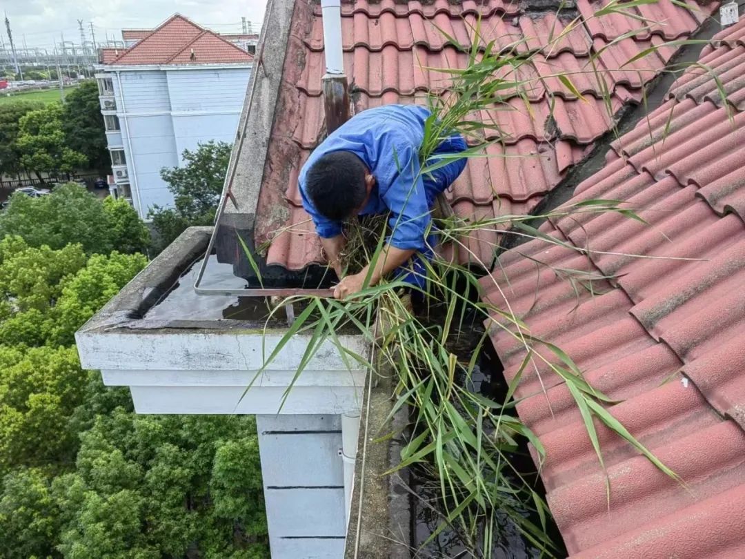 此外,工作人员还清理了居民楼楼顶的杂草和堆物,避免发生雨季排水不畅、管道堵塞等问题。