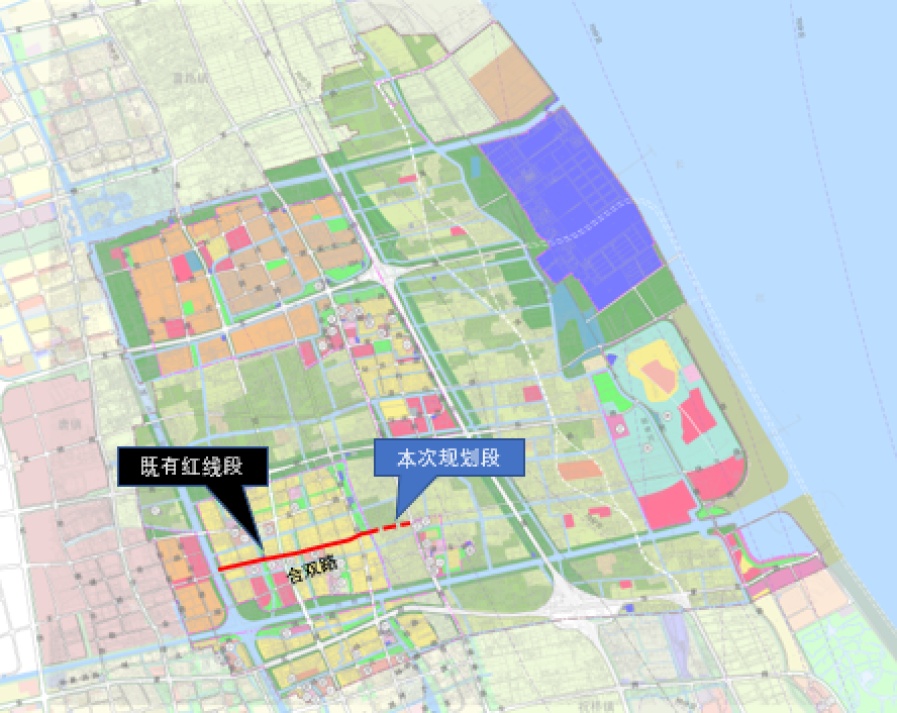 合双路是合庆镇内重要的东西向次干路。合双路既有规划红线西至浦东运河,东至塘西中心河中心线,向东尚无道路红线,无法形成区域对外的道路贯通。