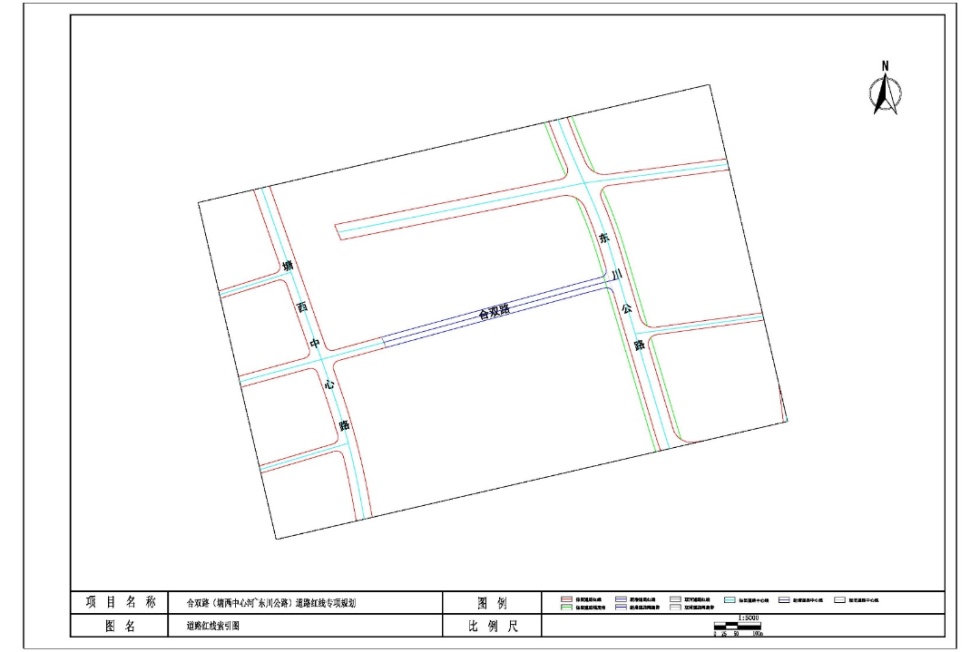 道路线型:合双路新增红线段长503米,西起原规划合双路道路红线,向东顺接至东川公路,整体线型避让基本农田,标准段红线宽度为24米,局部红线压缩为23.95米 。塘西中心路-合双路交叉口为十字交叉口,东川公路-合双路交叉口为T型交叉口。