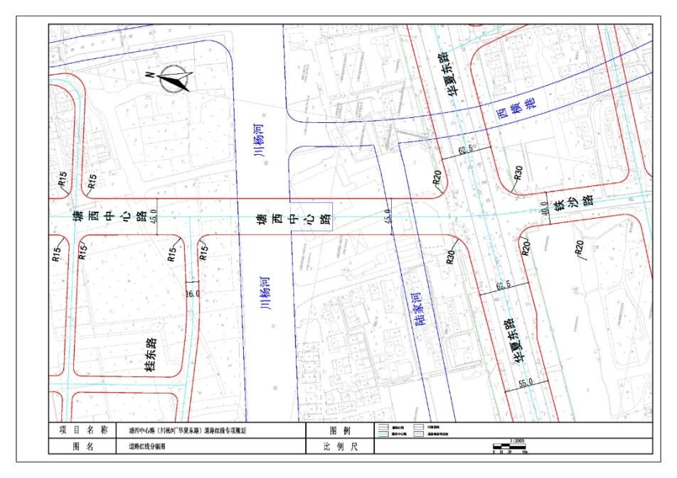 道路线型:北起原规划塘西中心路道路中心线,向南顺接至华夏东路铁沙路交叉口,新增红线宽度为45米;路线自北向南采取上跨桥梁形式上跨川杨河,跨线桥双向4车道规模。