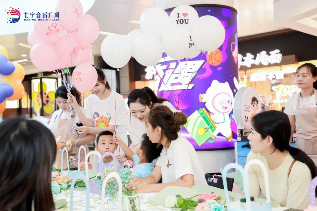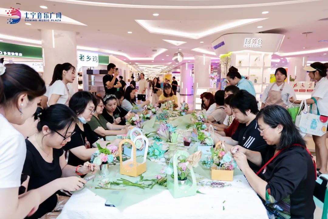 此外,为贴近与消费者之间的距离,吸引更多市民共赴浪漫,大宁音乐广场特与商场入驻店铺在周末晚联动开展包含“七夕插花DIY ”等在内的室内聚客活动。