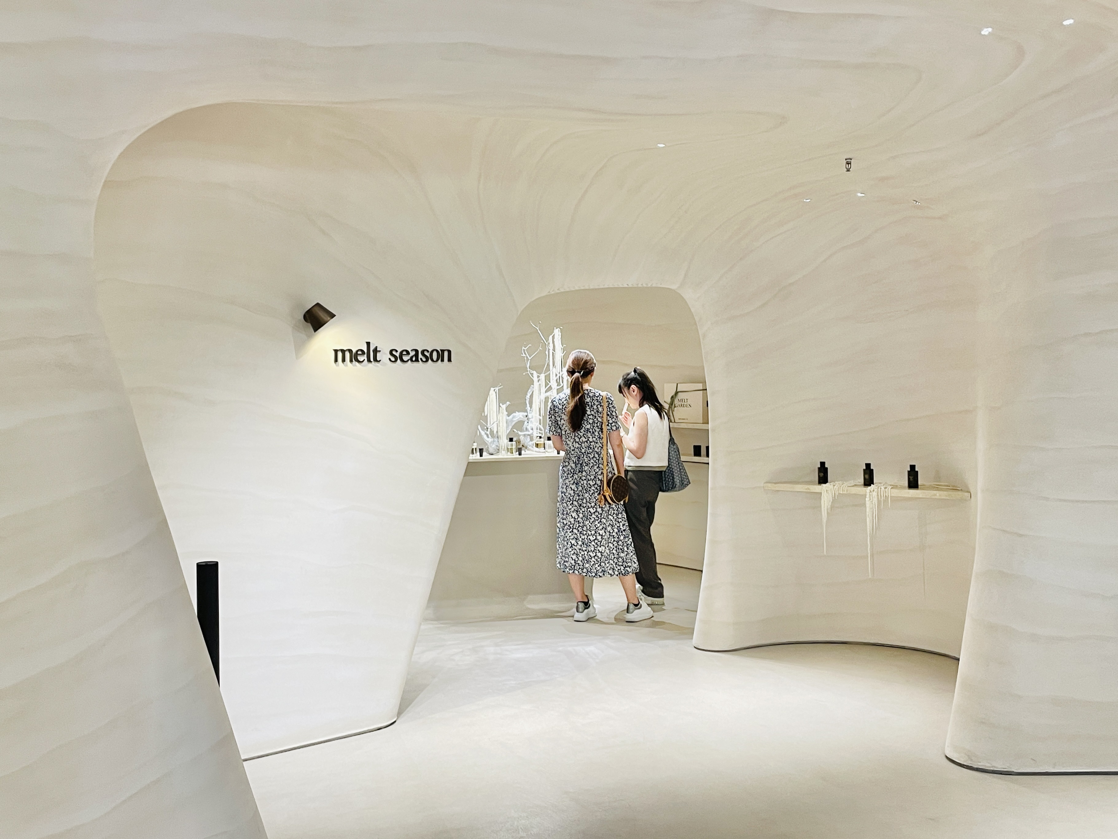 游走在北区B1寻香的过程中,还有不少消费者会被一个造型奇特、形似岩洞的空间所吸引,进入后更是别有洞天。原来这是香水品牌“melt season岩语”于7月底开业的新店。