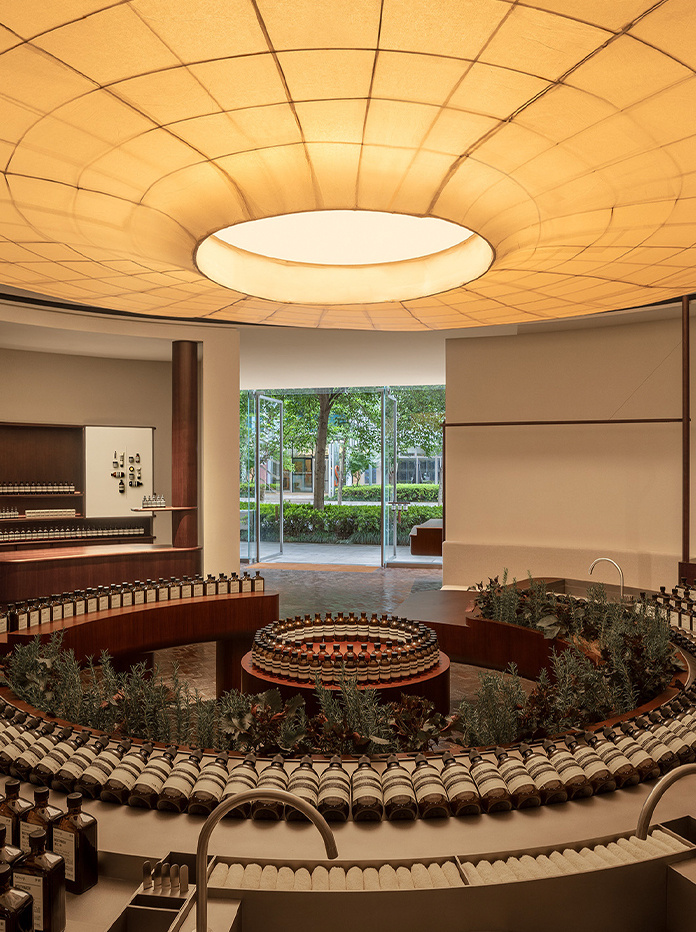 店铺整体设计以“圆融新生”为主题,圆润流畅的线条大量运用于空间之中,于闹市中建立了一方惬意圆形空间。无论是悬置于水槽上、出自非遗传承人之手的巨型灯笼,或是景德镇废弃陶瓷再生的地砖,无处不体现着独特的“Aēsop式样”设计美学。在产品方面,伊索的产品系列横跨护肤、洗护发、身体、香氛和家居等,多年来主打天然成分的标签,已经在消费者心目中留下了深刻印象。