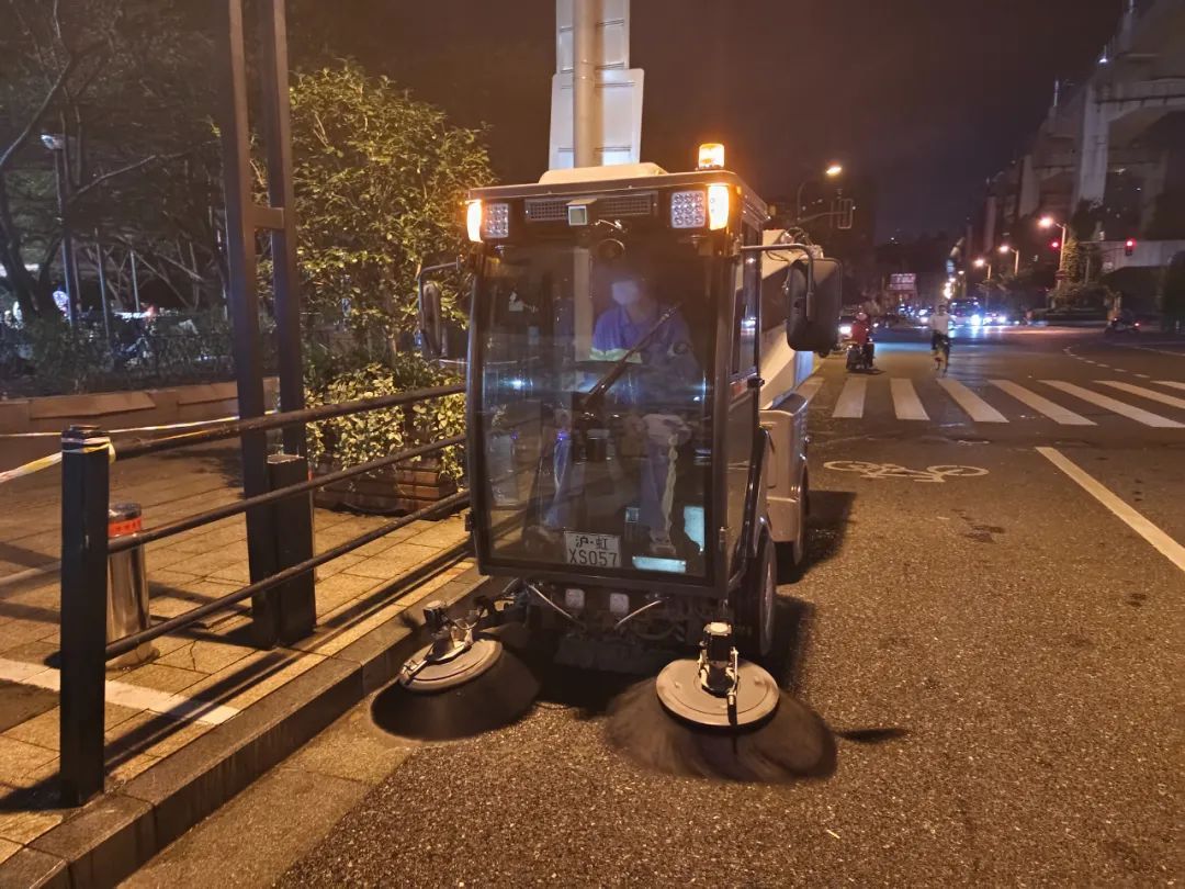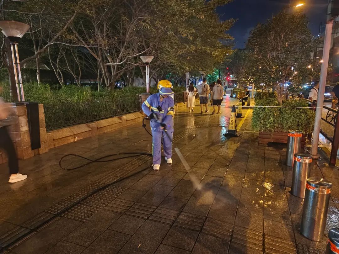 随着人流逐渐散尽,新一轮的保洁工作也马上开始。扫地车、收集车、冲洗车轮番出动,陈娟与4位保洁人员对东江湾路马路和人行道等重点区域进行清扫和冲洗保洁。
