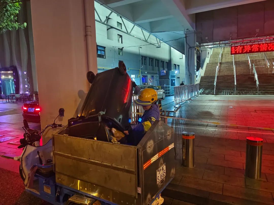 期间,她和同事们一起拿出了作业工具,放到不妨碍交通、没有安全隐患的点位,为接下来的重点区域冲洗和保洁做好准备。