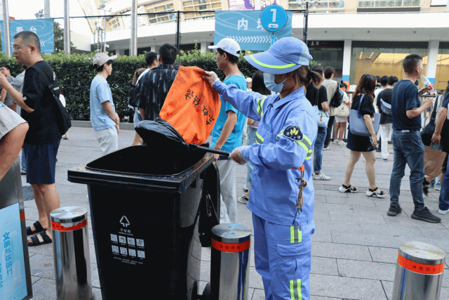 临近晚上10点,在一阵欢呼声中,林俊杰演唱会落下帷幕,歌迷们开始陆续散场。此时,大家的手中已经“积攒”不少垃圾,为了保证干垃圾桶和废物箱不满溢,陈娟不时来回巡视,及时更换垃圾袋。