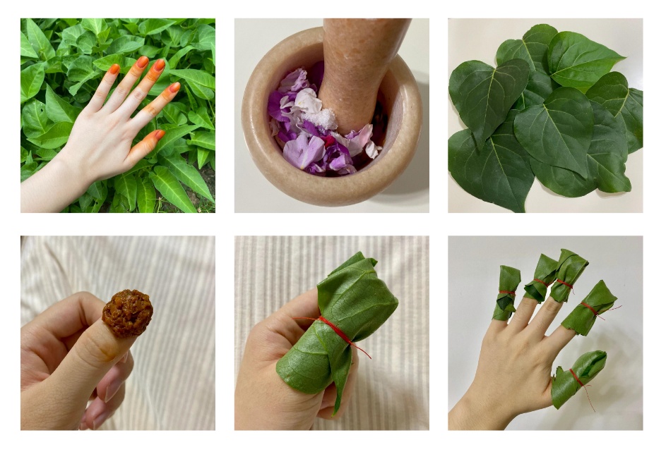 ·用叶子包住、并用线缠好(不轻易脱落即可),其它指头同样方法操作