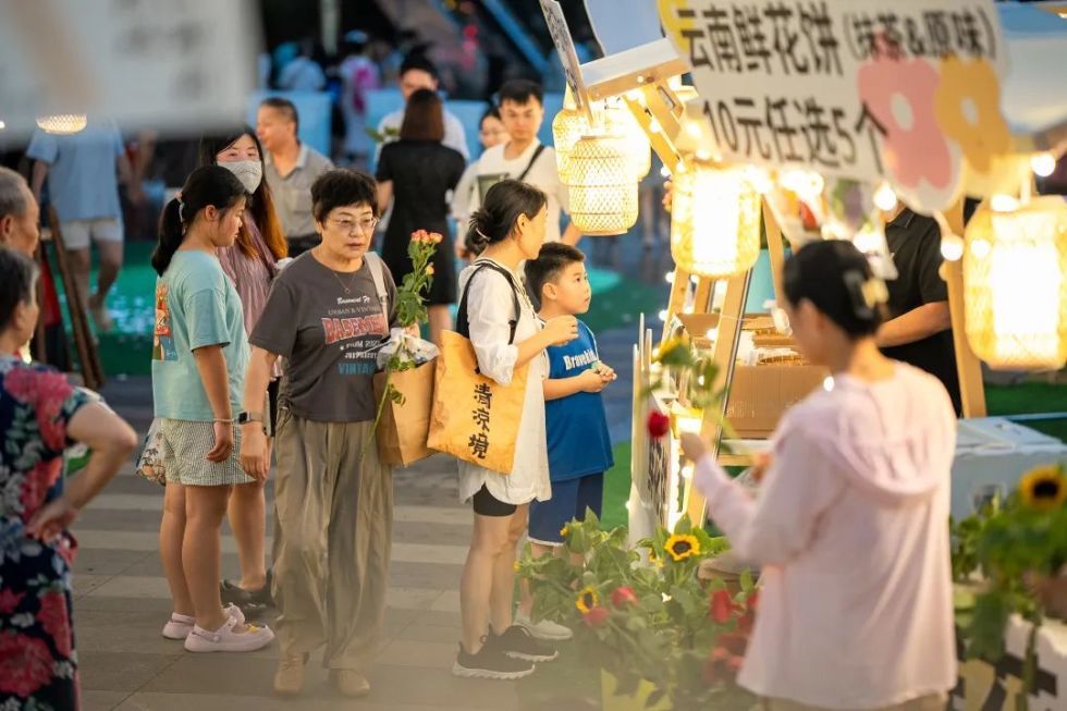 以云南特有的食用玫瑰花入料的鲜花饼,也是市集上的热门美味。冷先生在自家摊位上摆满了一箱箱鲜花饼,摊位周边被专门空运来的鲜花包围。“鲜花饼10元5个,买一份可以免费领一枝花,向日葵、玫瑰任选,正好七夕节,给大家多一份甜蜜和浪漫。”冷先生说。