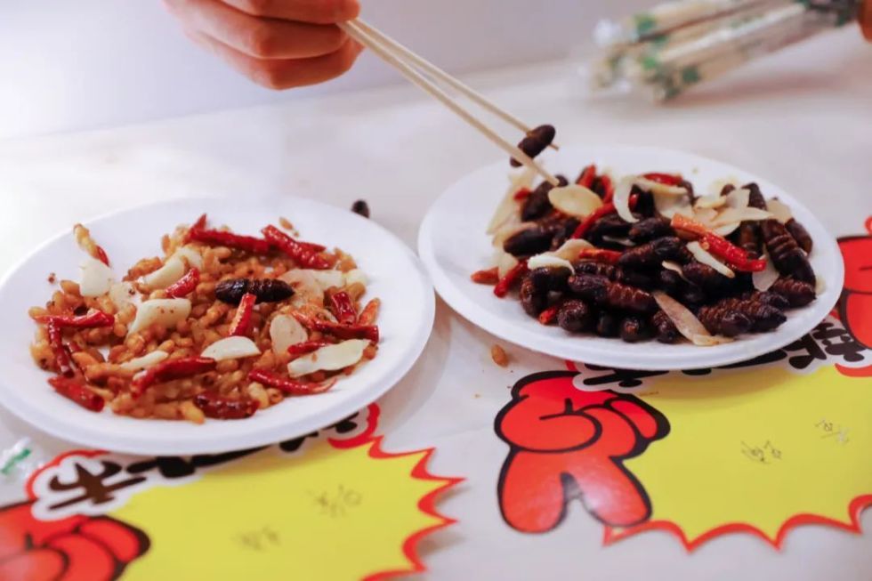 油炸昆虫是云南极富特色的美食,入口酥脆鲜香,是下酒的好菜。王师傅在云南临沧开着一家小吃店,这次专门带了蜂蛹、蚕蛹、知了等十来种昆虫来到市集,让上海市民尝一尝正宗的云南味道。只见王师傅起锅烧油,放入些许辣椒、蒜片爆香后倒入蚕蛹油炸,出锅前撒上盐,周围顿时香气扑鼻,不少市民驻足尝鲜。