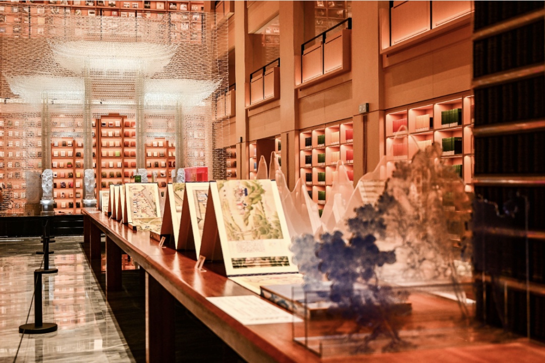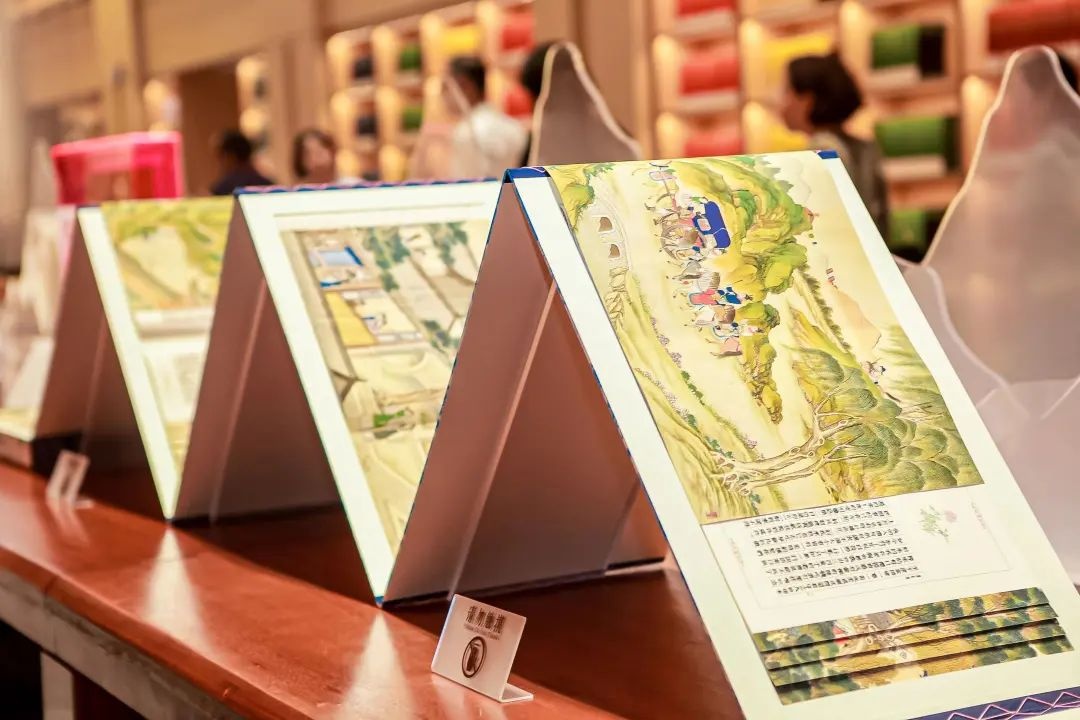 徐家汇书院长达16米的海上书桌,几轴古色古香的书画长卷蔓延展开,这里承托着非遗传承的龙鳞装长卷。与传统的卷轴展示方式不同,这些特别的画卷放置于波浪形的展架上,层层叠叠,宛如龙鳞的书页自然呈现,这也是本次亮点之一。