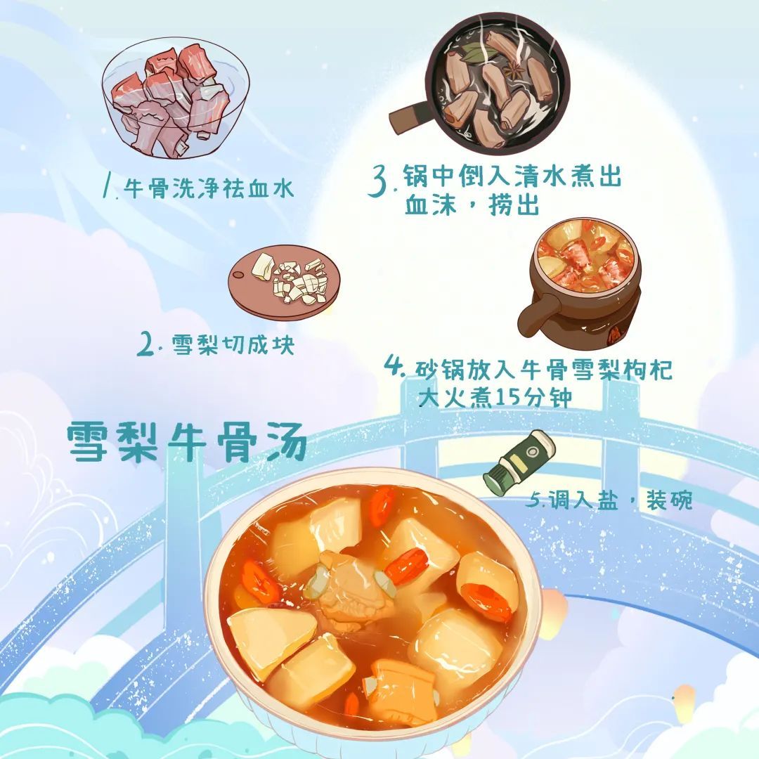 一盅好汤需要花时间、耐心,慢慢炖。香气是慢慢升起来的,喜悦也是慢慢升起来的,直到水与食材互相渗透,慢慢无间,芳香浓郁,成为一体。雪梨止咳、降火和润肺的功效搭配牛骨汤中丰富的碳酸钙喝到嘴里,暖进心中,熨帖滋润。就像爱情随着岁月的流逝,褪去激情,留下淡淡的温暖。
