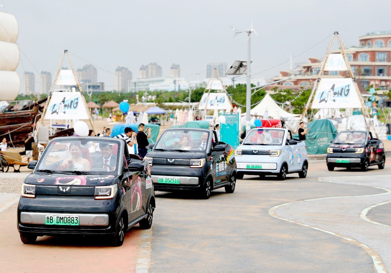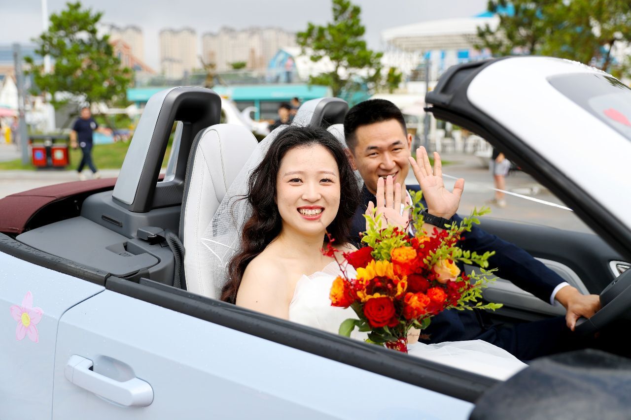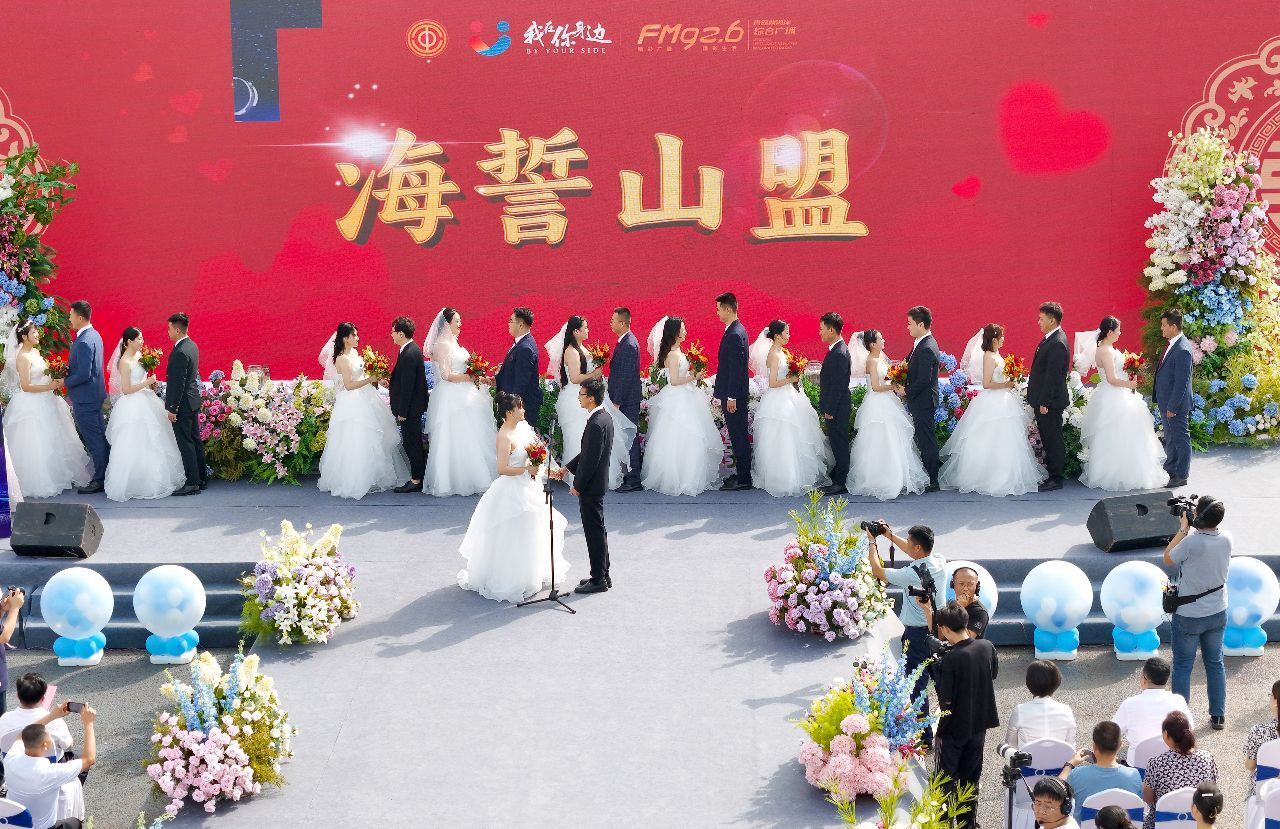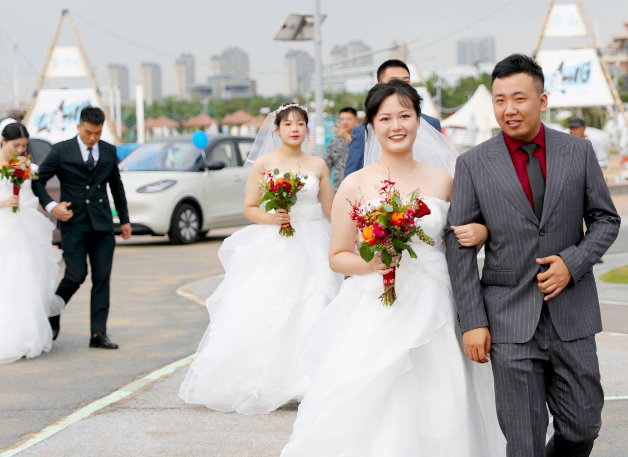 8月22日,在位于青岛西海岸新区的青岛金沙滩啤酒城爱情港湾,一场以“我在你身边•金沙滩之恋”为主题的新时代文明实践集体婚礼举行,12对新人自驾新能源汽车来到婚礼现场,互戴结婚戒指,许下爱的誓言。(大众日报客户端记者 卢鹏 通讯员 张进刚 报道)