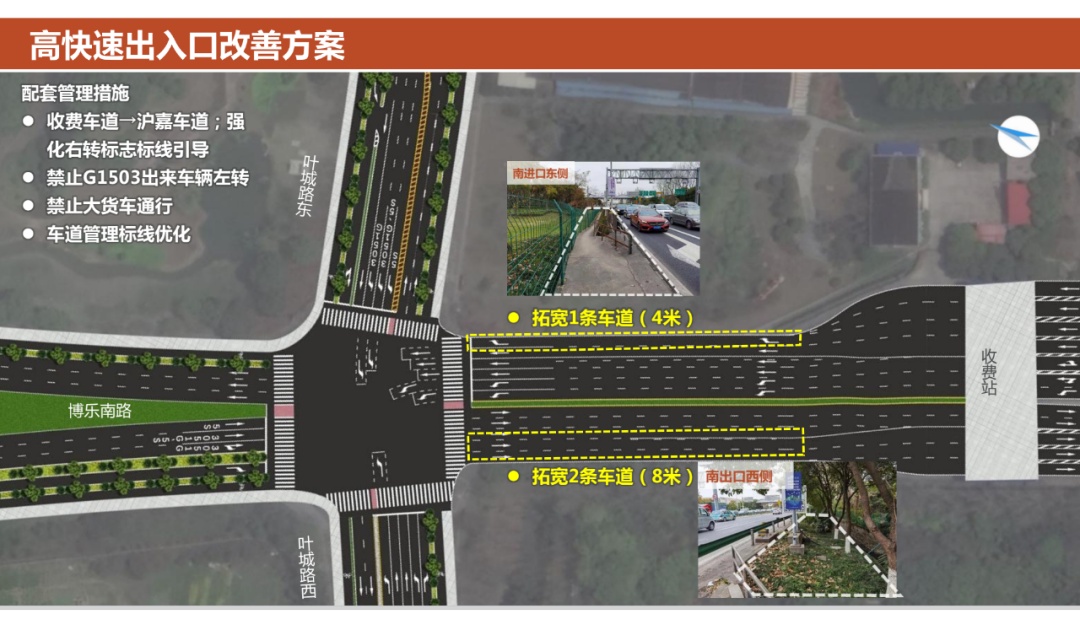 目前,S5沪嘉快速路南门出入口双向共设有8条机动车道,其中出口方向为5条,包括2条左转、2条直行、1条右转,入口方向为3条,包括2条市区方向、1条G1503方向。