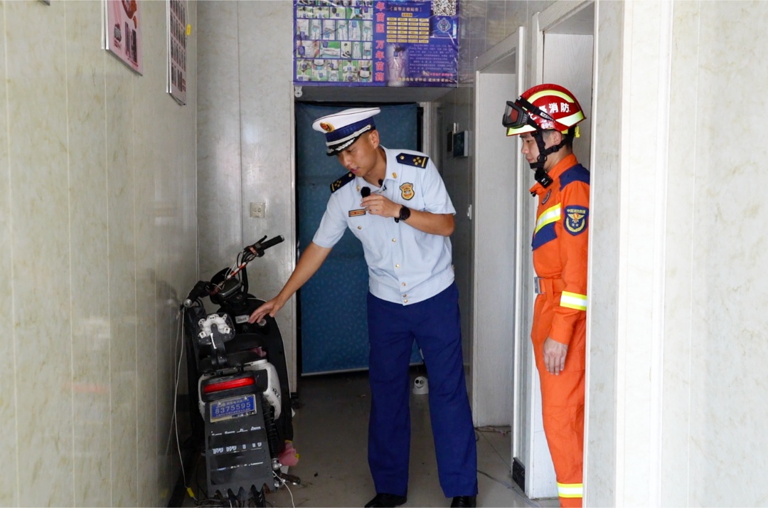 现场模拟的火灾实景是在楼梯转角处设置了一辆电动自行车,电动自行车违规停放、充电也是过往火灾案例中一类很常见的容易引发火灾的行为。同时,消防员在小房间里设置了一个假人的住宿区域。