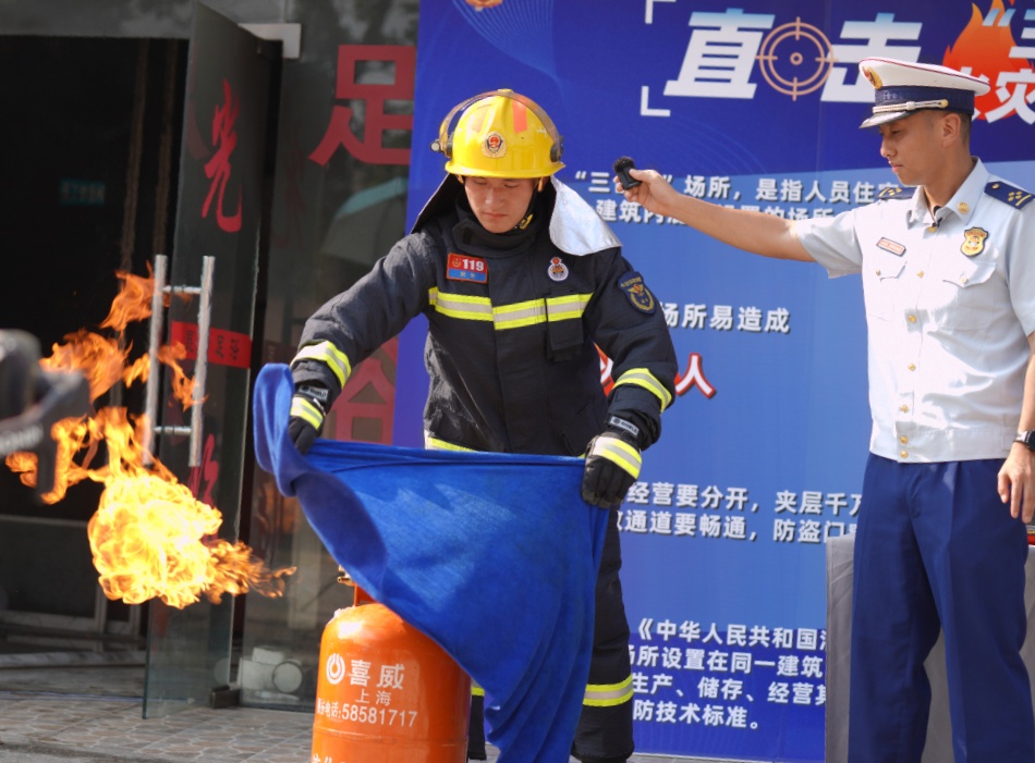 另外,针对许多沿街商铺存在违规使用瓶装液化气,以及近期燃气爆炸事故频发的情况,消防人员也在现场利用瓶装液化气做了相关试验,向大家演示了煤气罐起火时应如何正确处置。当液化气钢瓶起火时,如果罐体没有问题,阀门好用,首先要保持冷静,一定要先选择一个合理的站位,用抹布或湿毛巾都可以将其扑灭。