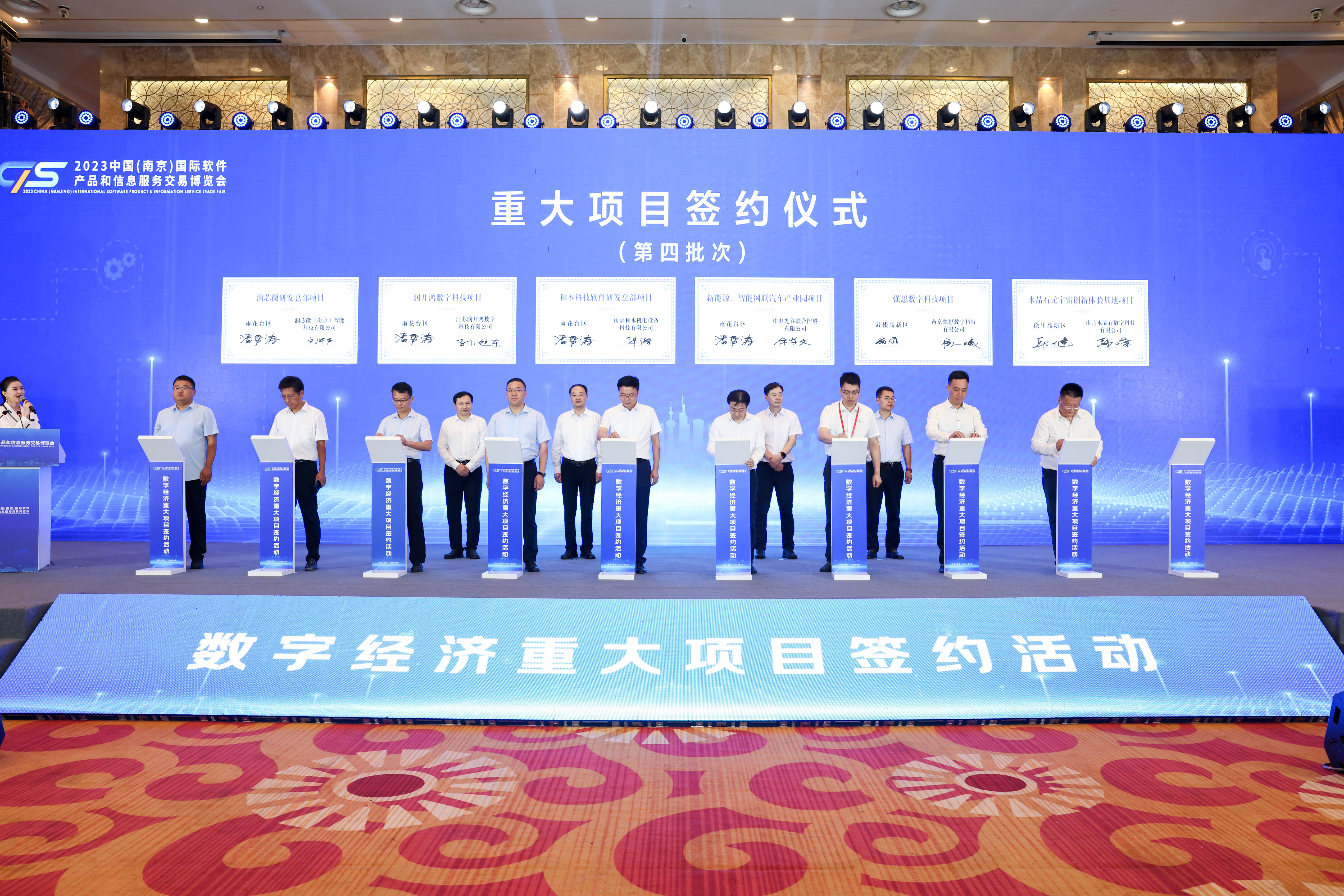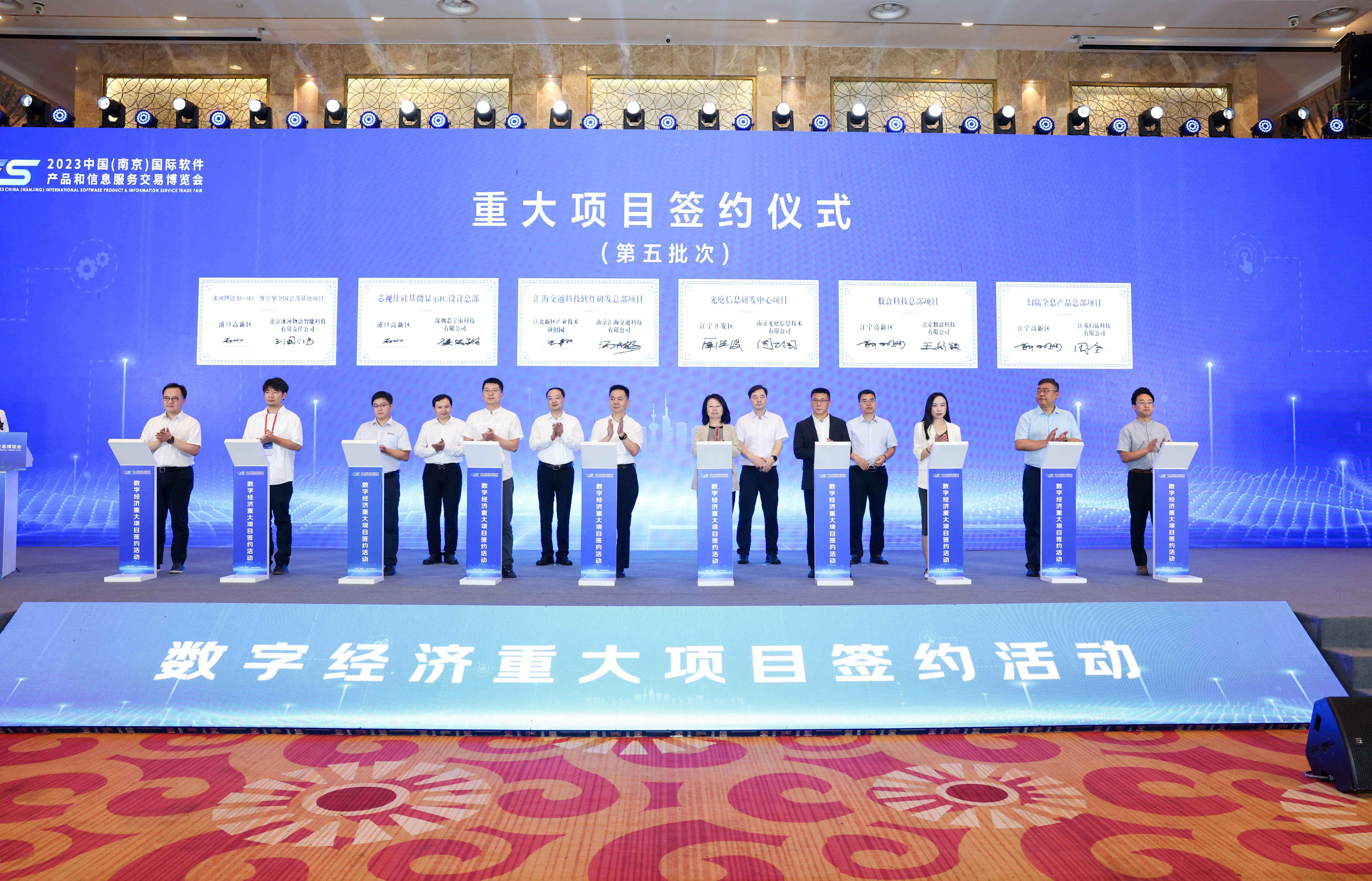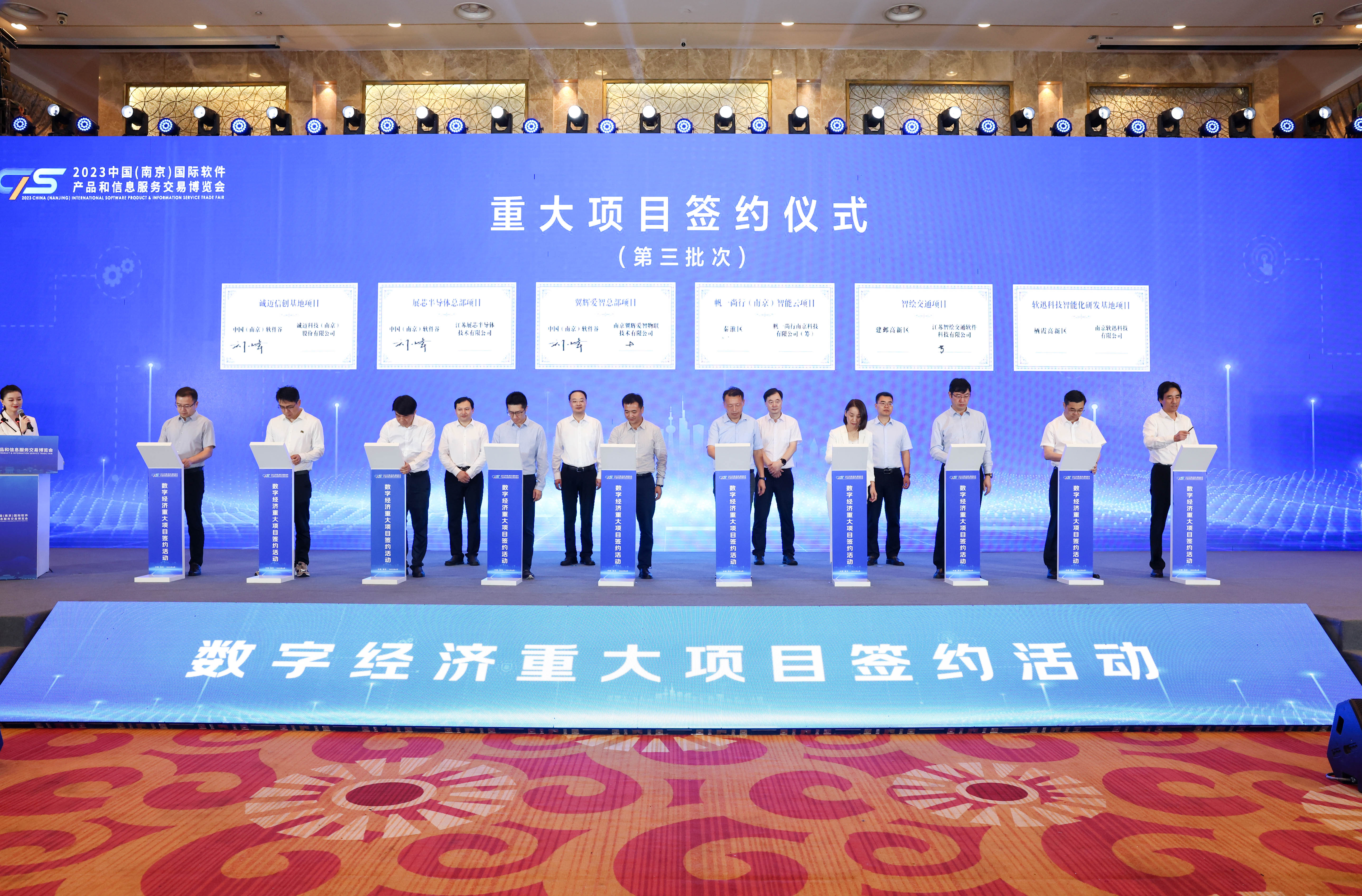 交汇点讯 8月23日,2023中国(南京)国际软件产品和信息服务交易博览会数字经济重大项目签约活动举行。本届软博会最终达成洽谈签约项目47个,总投资达223.9亿元。签约活动中,国机集团数字科技总部项目、国家5G创新中心南京项目等20个具有代表性的数字经济重大项目集中签约,总投资124.9亿元。