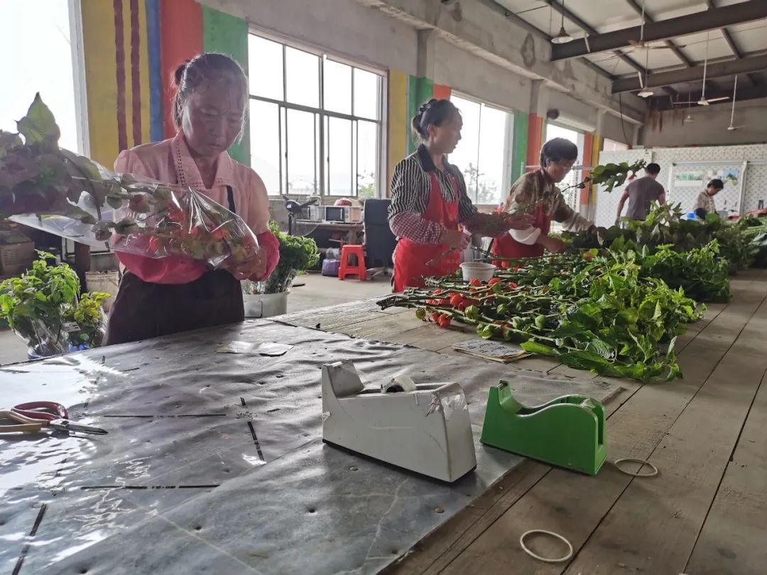 包装车间内,工人们去除叶片后将花材打包装箱。负责人介绍,酸浆果属于茄科草本植物,参考国外的出货标准,一根枝头上长有5个果以上的花材属于佳品。