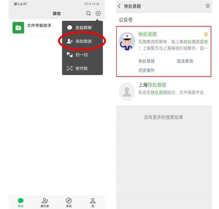 打开微信,搜索“快处易赔”微信公众号并关注。
