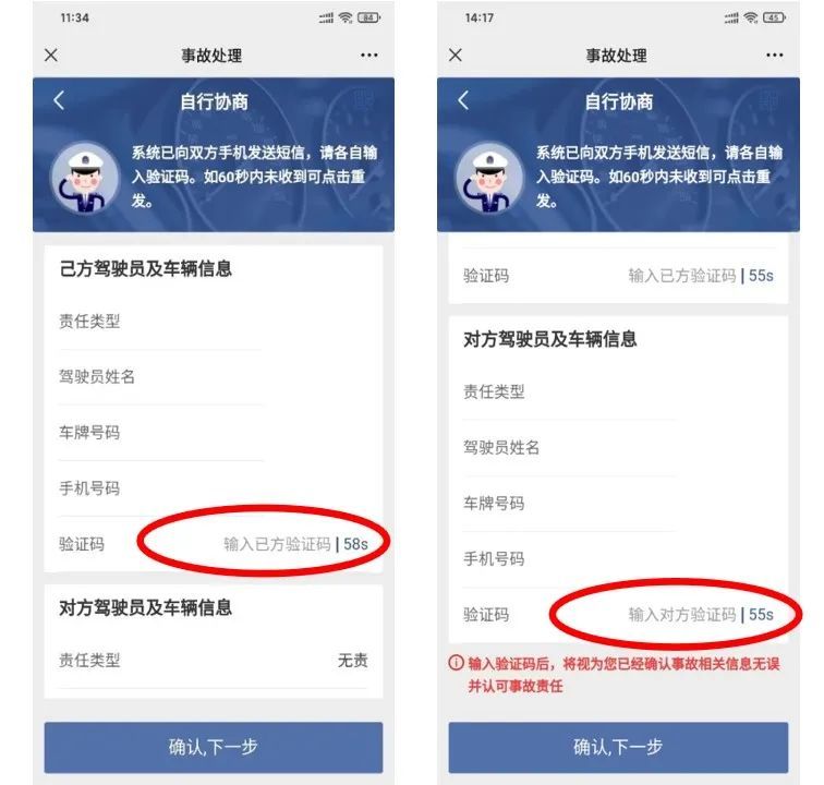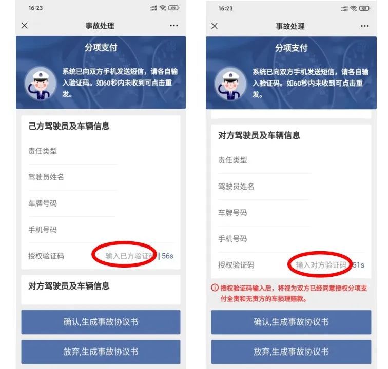 同意授权后系统将向双方手机发送短信验证码,依次填写双方收到的验证码后点击“确认,生成事故协议书” 。