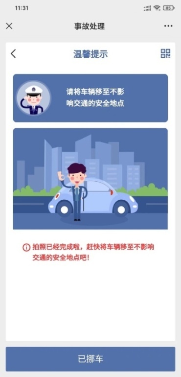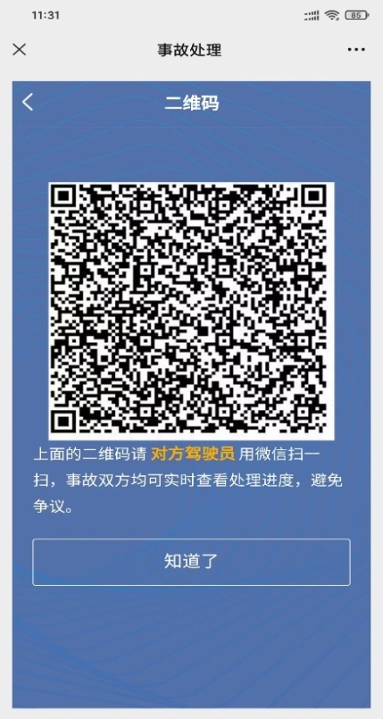 点击“拍照完成”,系统自动生成二维码,让对方驾驶员微信扫码,后续可查看处理进度。