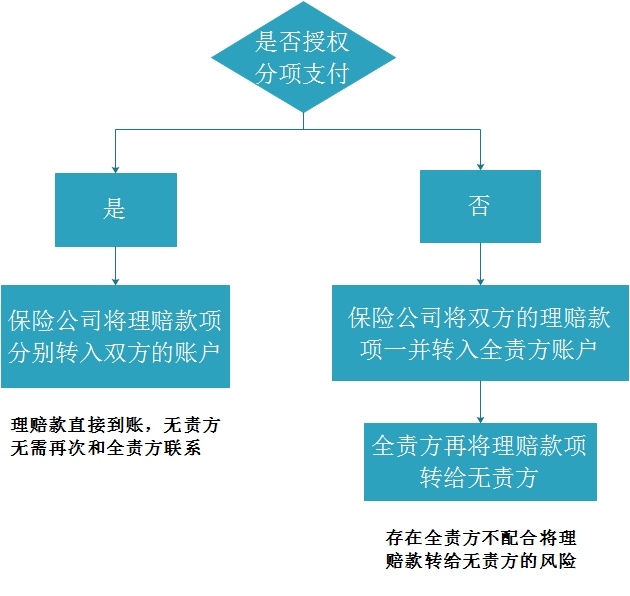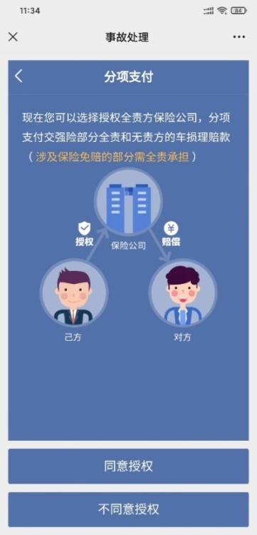 全责方可以授权保险公司分项支付理赔费用。建议使用分项支付,理赔款分别转入各方的账户,避免全责方收款后不配合赔付的风险。如不同意授权将直接跳转到生成事故协议书界面。