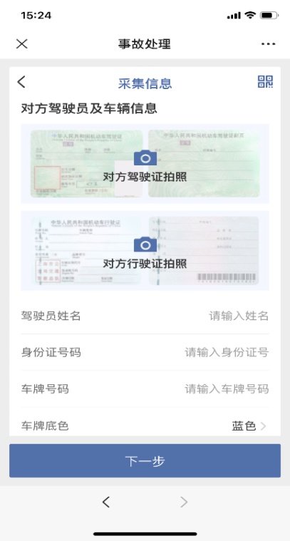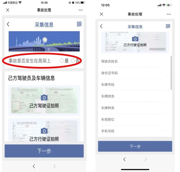 进入采集信息环节,首先确认事故是否发生在高架上。然后拍摄己方驾驶证、行驶证照片,填写己方人员及车辆信息。