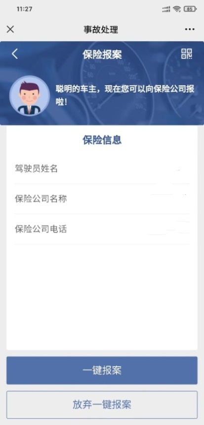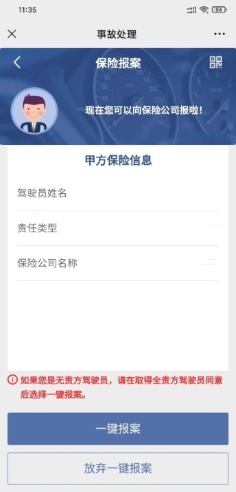 若全责方保险公司已开通“一键报案”,协议书生成后将进入“一键报案”页面。(注:未开通“一键报案”的,应直接致电保险公司报案)