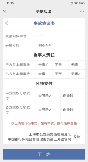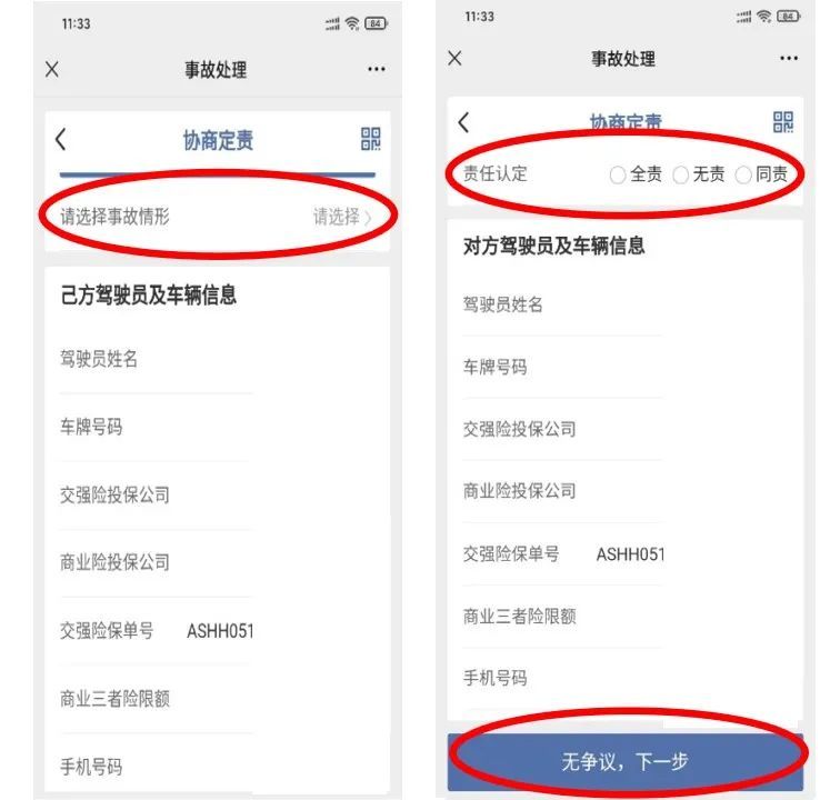 信息采集完毕,进入协商定责页面,选择事故情形,勾选责任认定后点击“无争议,下一步”。