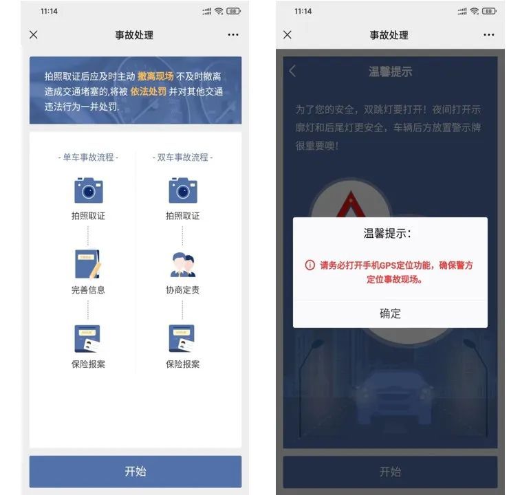了解线上事故处理流程,点击“开始”。使用中确保手机打开GPS定位功能,系统将自动定位事故地点。