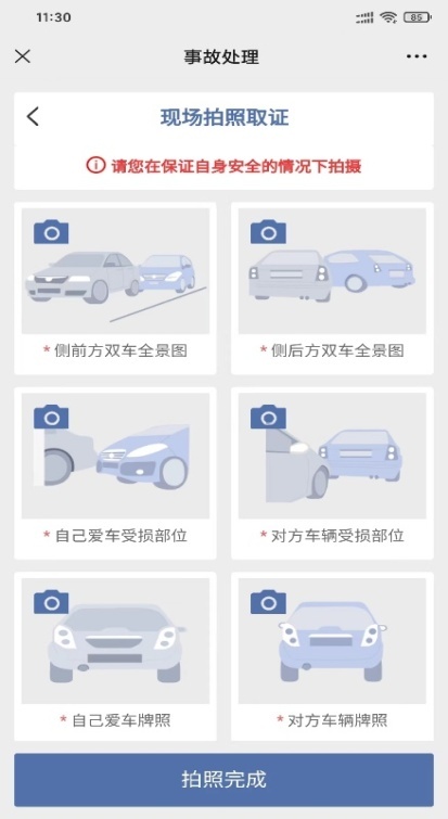 按照提示拍摄六张照片(侧前方双车全景图、侧后方双车全景图、自己车辆受损部位及车辆牌照、对方车辆受损部位及车辆牌照)。