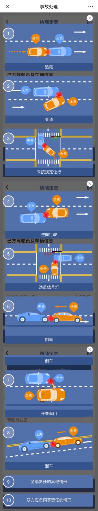 事故情形包括:追尾、变道、未按规定让行、逆向行驶、违反信号灯、倒车、开关车门、溜车等。
