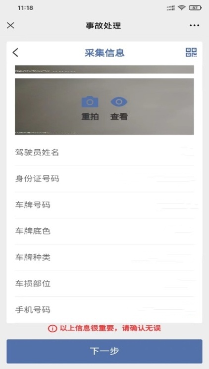 进入采集信息环节,首先确认事故是否发生在高架上。其次拍摄自己的驾驶证、行驶证照片。最后填写人员及车辆信息。