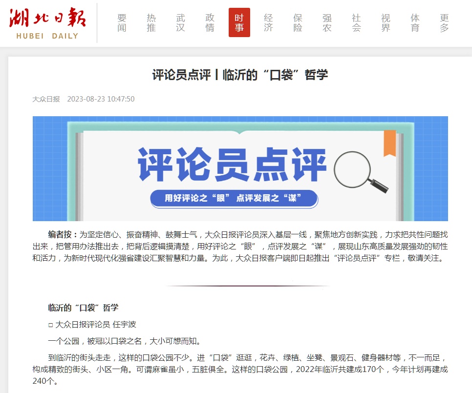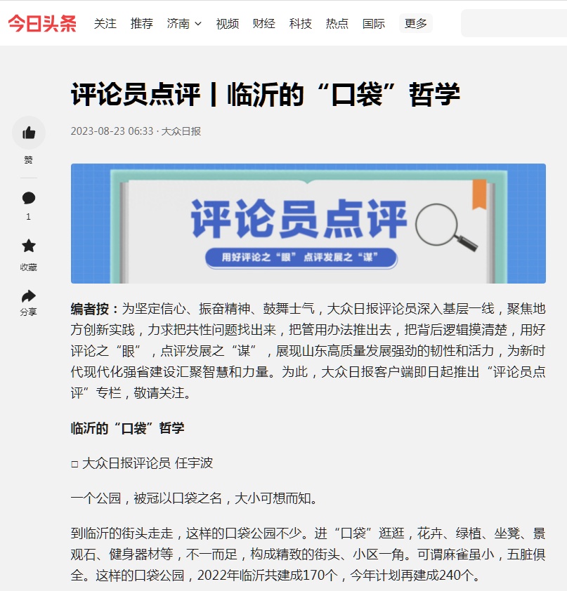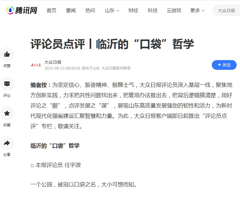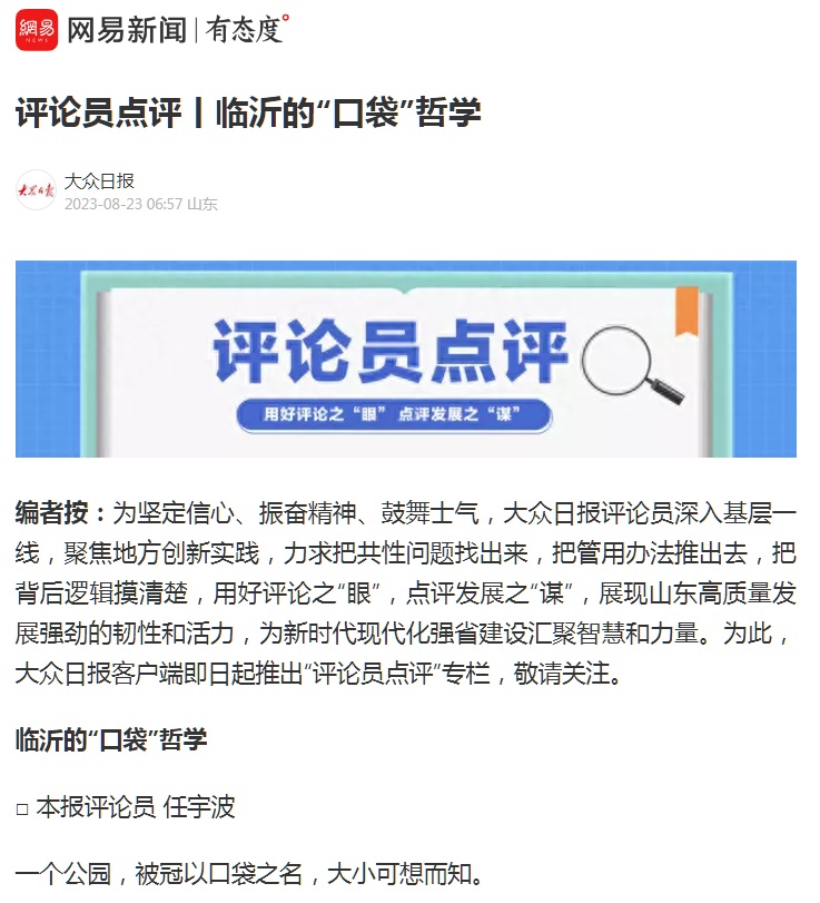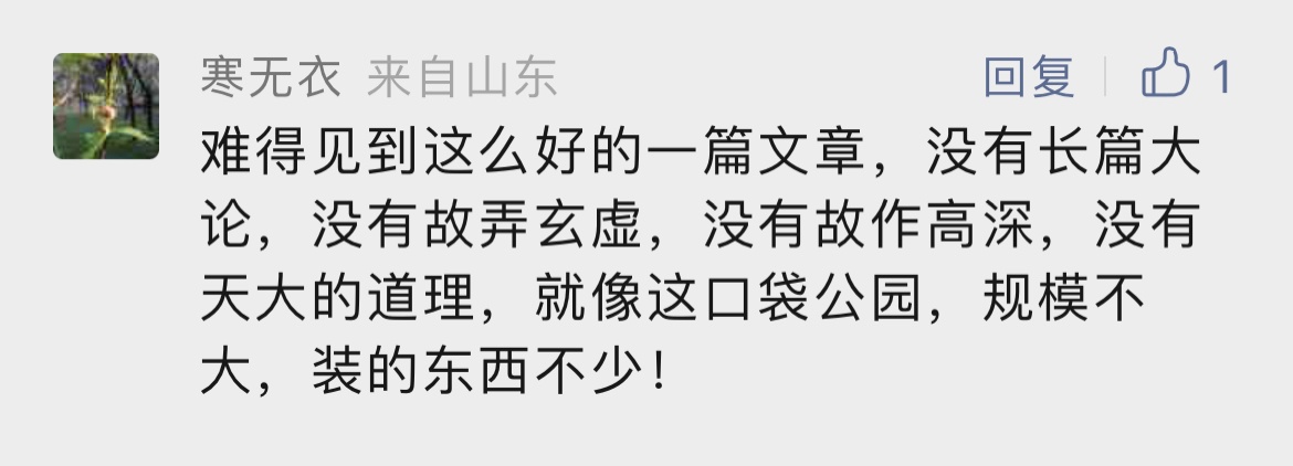 有网友跟帖:“难得见到这么好的一篇文章,没有长篇大论,没有故弄玄虚,没有故作高深,没有天大的道理,就像这口袋公园,规模不大,装的东西不少!”