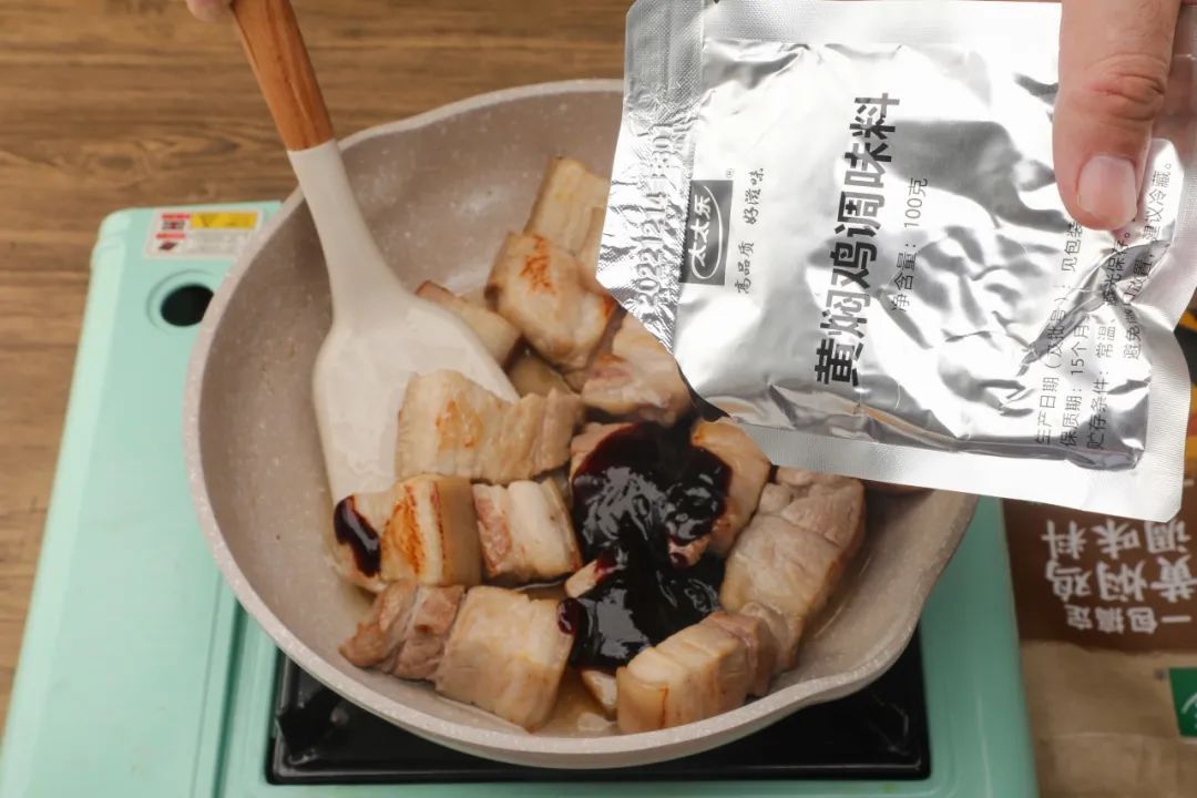 3.锅中倒少许油,将五花肉煸炒至表面微黄,放入黄焖鸡调味料并翻炒均匀,加入啤酒、白糖后烧开。