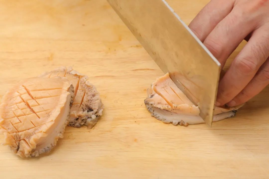 1.鲍鱼洗净后改十字花刀,焯水备用。