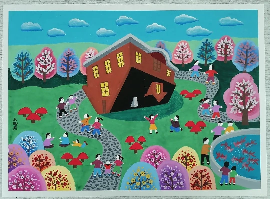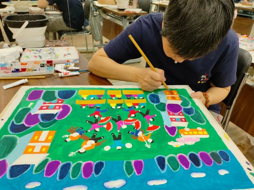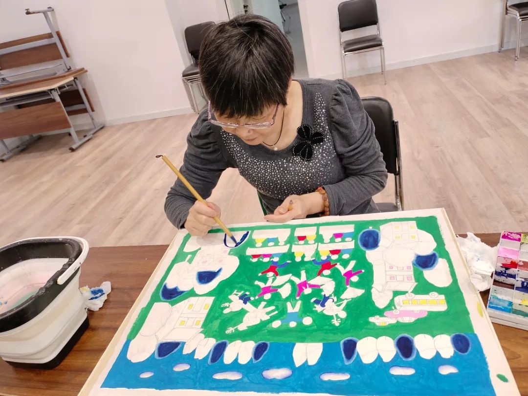 在金山农民画画家严军杰的指导下,学员们在短短5个月内成功创作了近20幅原创作品。从刚开始的临摹到现在的独立创作,学员们收获了满满的成就感,严军杰更是倍感欣慰:“学员们认真的学习态度和他们创作的每一幅作品,都是我带教的力量源泉。”