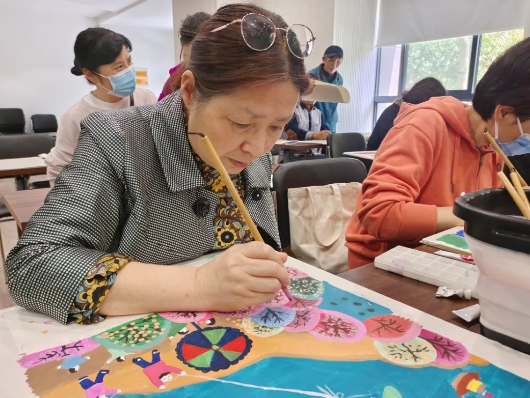 为了更好地传承和发扬金山农民画,进一步推动“种画育人”,2023年3月,在金山区农民画院、山阳镇文体中心、山阳镇社区老年学校的大力支持下,山阳镇“有农有画”金山农民画传承学习班香颂湾学习点,在香颂湾党群服务站综合活动室开班,有来自香颂湾居民区和邻近社区的近20余名零基础农民画爱好者参加。
