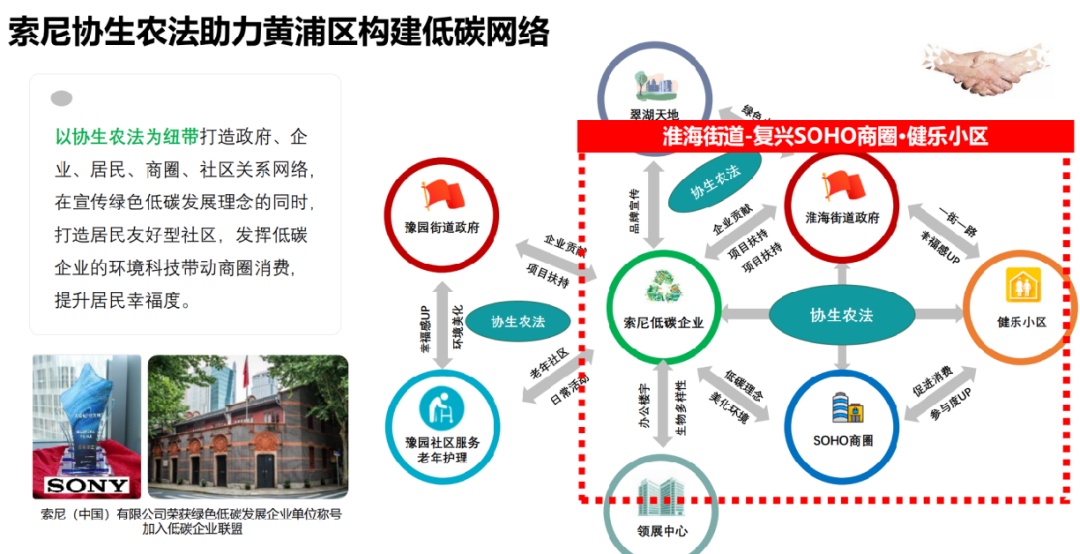 据淮海中路街道办事处主任康永利回忆,联盟成立当天,成员企业索尼的协生农法技术在会场进行的公开展示,就获得了与会人员的关注。协生农法是由索尼计算机科学研究所研发的创新农业技术,该技术通过高密度混种,利用生态系统的自我组织能力种植有用作物。在今年街道“一街一路”项目建设中,SOHO绿地以及健乐小区微景观改造项目就与索尼公司进行深度合作,通过将协生农法技术引入街区改造,有效提升区域环境。康永利说:“我们将以此为纽带打造政府、企业、居民、商圈、社区共治网络,在宣传绿色低碳发展理念的同时,打造居民友好型社区,发挥低碳企业的环境科技带动商圈消费能力,不断提升居民群众的幸福指数。”