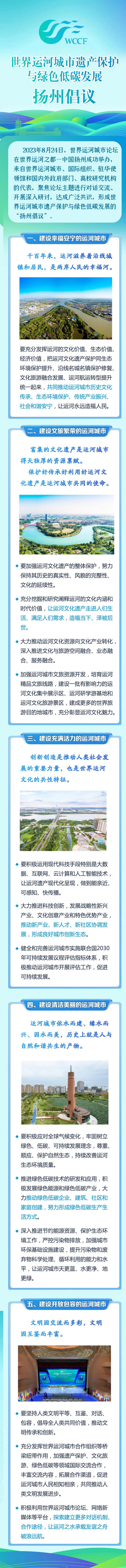 交汇点讯 8月24日,2023世界运河城市论坛在扬州举办,本次论坛以“运河城市遗产保护与绿色低碳发展”为主题,国内外嘉宾聚焦主题对话交流,形成世界运河城市遗产保护与绿色低碳发展的“扬州倡议”,“扬州倡议”全文如下: