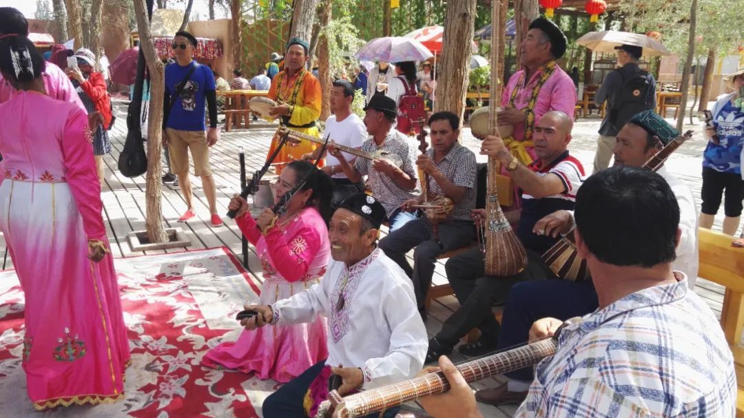 亚森·艾萨(前排白衣老者)在表演非遗乔康麦西来普