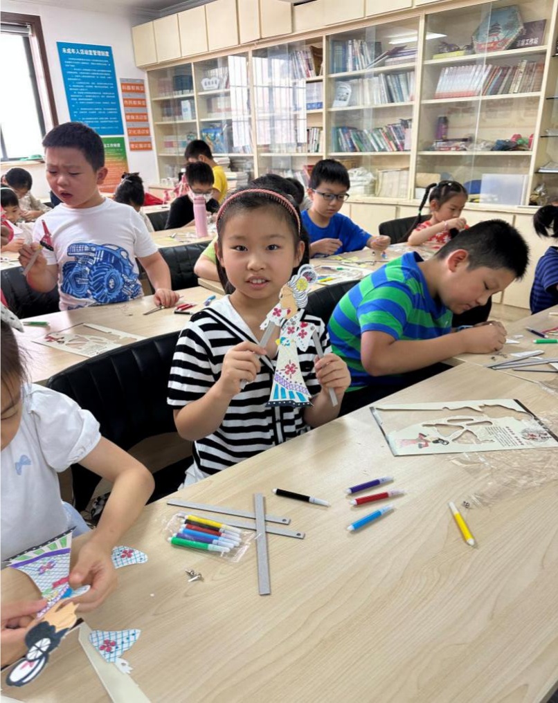在老师的指导下,大家将人物慢慢地撕下来,然后拿起画笔对着自己的皮影进行绘画创作,为人物画上精美的妆容,给漂亮的衣衫涂上鲜艳的色彩,将一个个零件组装成形态各异、富有神韵的皮影小人。最后,孩子们给每个人物都固定好“小手”,手上关节都能灵活活动。拿着自己的作品,孩子们一个个成就感满满。
