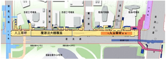 线路起自国家会展中心,终于13号线已建金运路站,沿诸光路——金丰路——联友路——纪宏路——金沙江西路走行。线路全长约9.47km,均采用地下敷设方式,设车站5座。其中诸光路站位于诸光路与崧泽大道交叉口南侧,沿诸光路南北向布置,车站西侧为联美A、E地块及百老汇1、2号地块,东侧为诸光路地道口及国家会展中心,北侧通过诸光路人行地道与17号线换乘,南侧与2号线站厅换乘,车站距离国家会展中心约50米,目前处于围护施工阶段。进博会期间,车站施工暂停,邻近国展中心区域采用覆罩法大棚覆盖,其余未施工区域采用人工草坪覆盖。