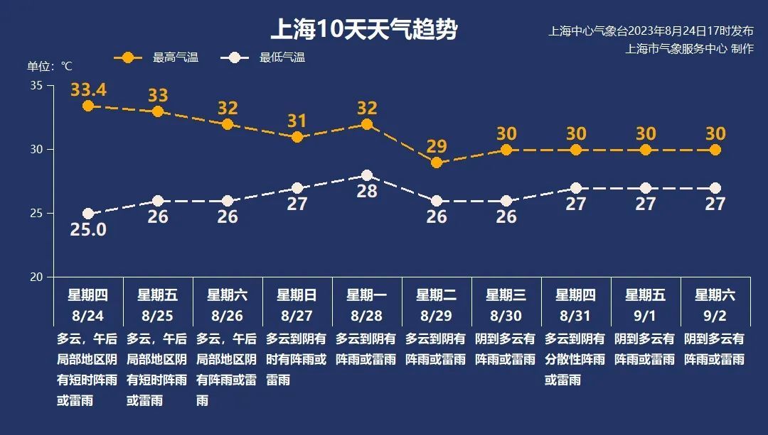 整体来看,未来一段时间没有高温打扰,炎炎暑热渐行渐远。其中,26~27日受海上偏东气流影响,申城以多云或阴的天气为主,有阵雨或雷雨天气袭扰,最高气温31~32℃,最低26-27℃。预计28~30日受冷空气影响,有一次较为明显的降雨过程,最高气温回落至30℃上下,或将跌至2字头。天气多变,今年第9号台风“苏拉”也将给未来天气形势带来变量,还请关注更新的预报预警信息。
