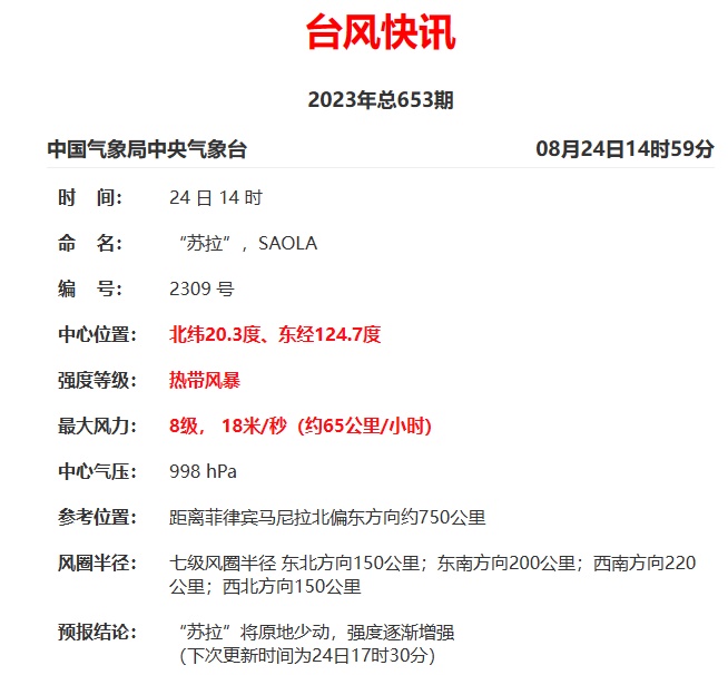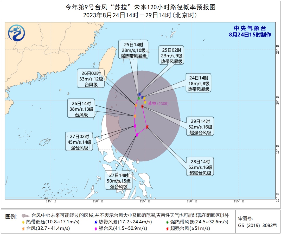 今年第9号台风“苏拉”已于今天下午14时开始编报,其中心位于距离菲律宾马尼拉北偏东方向约750公里的西北太平洋洋面上。预计“苏拉”将先在菲律宾吕宋岛东北部洋面徘徊,29日开始向北偏西方向移动,逐渐向台湾东部沿海靠近,最强可达强台风级或超强台风级。未来路径有较大不确定性,气象部门将严密监视,及时更新预报。