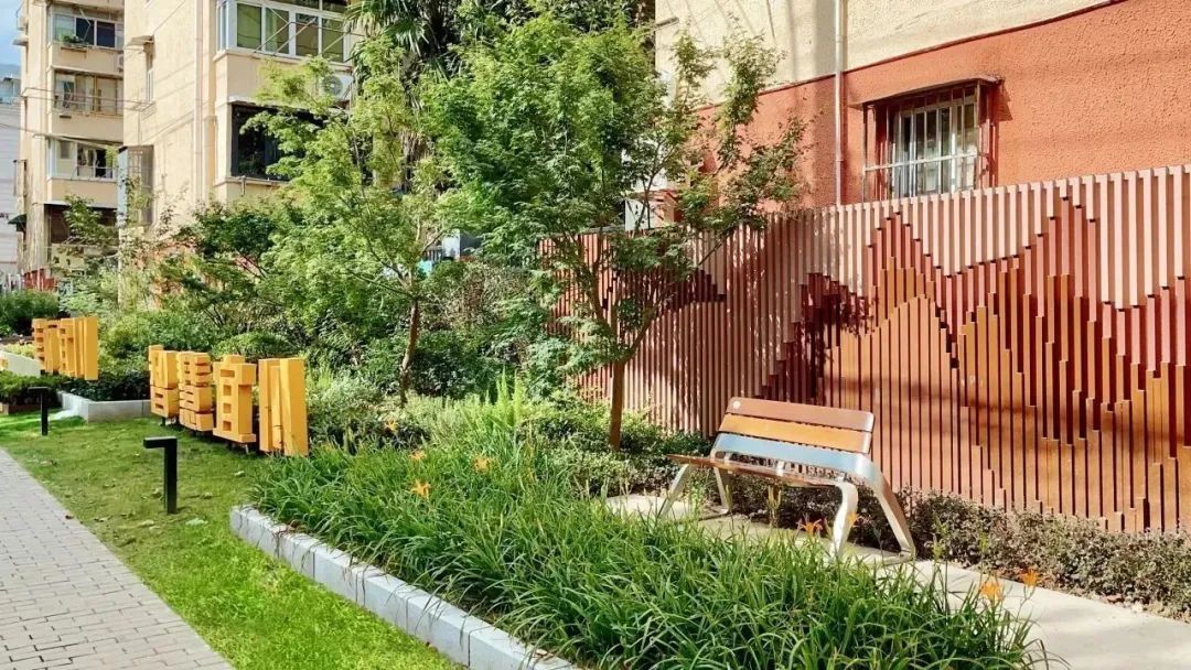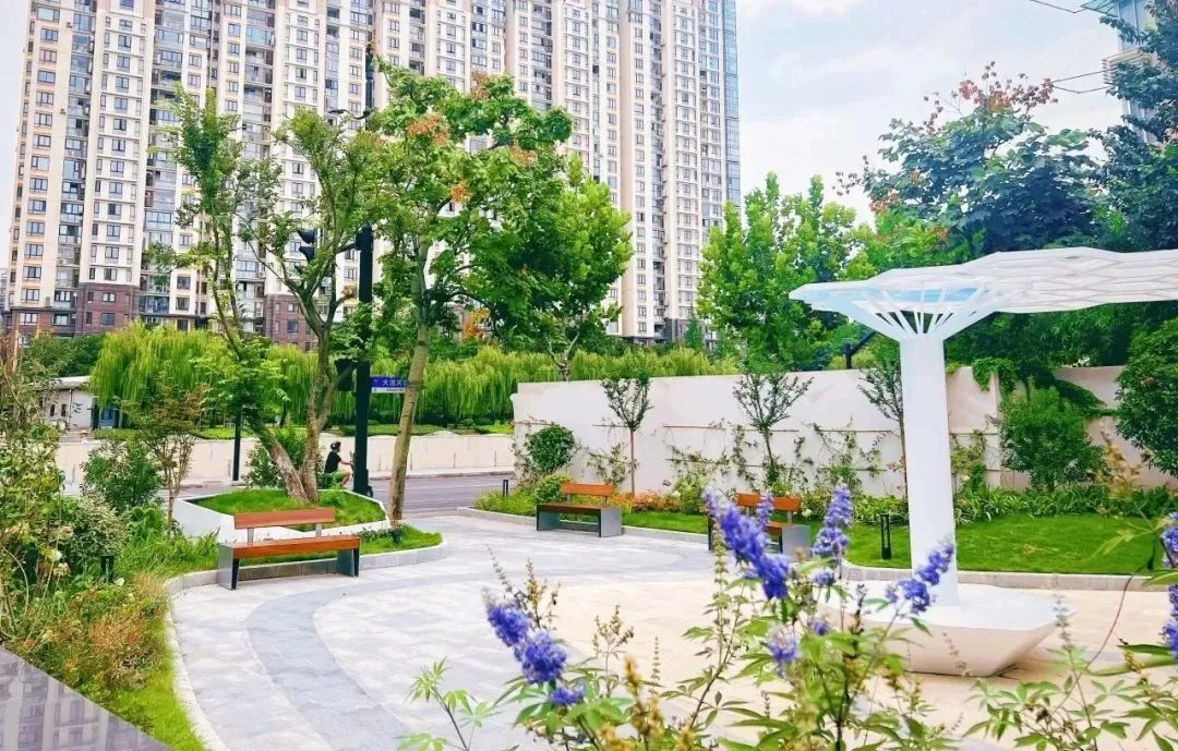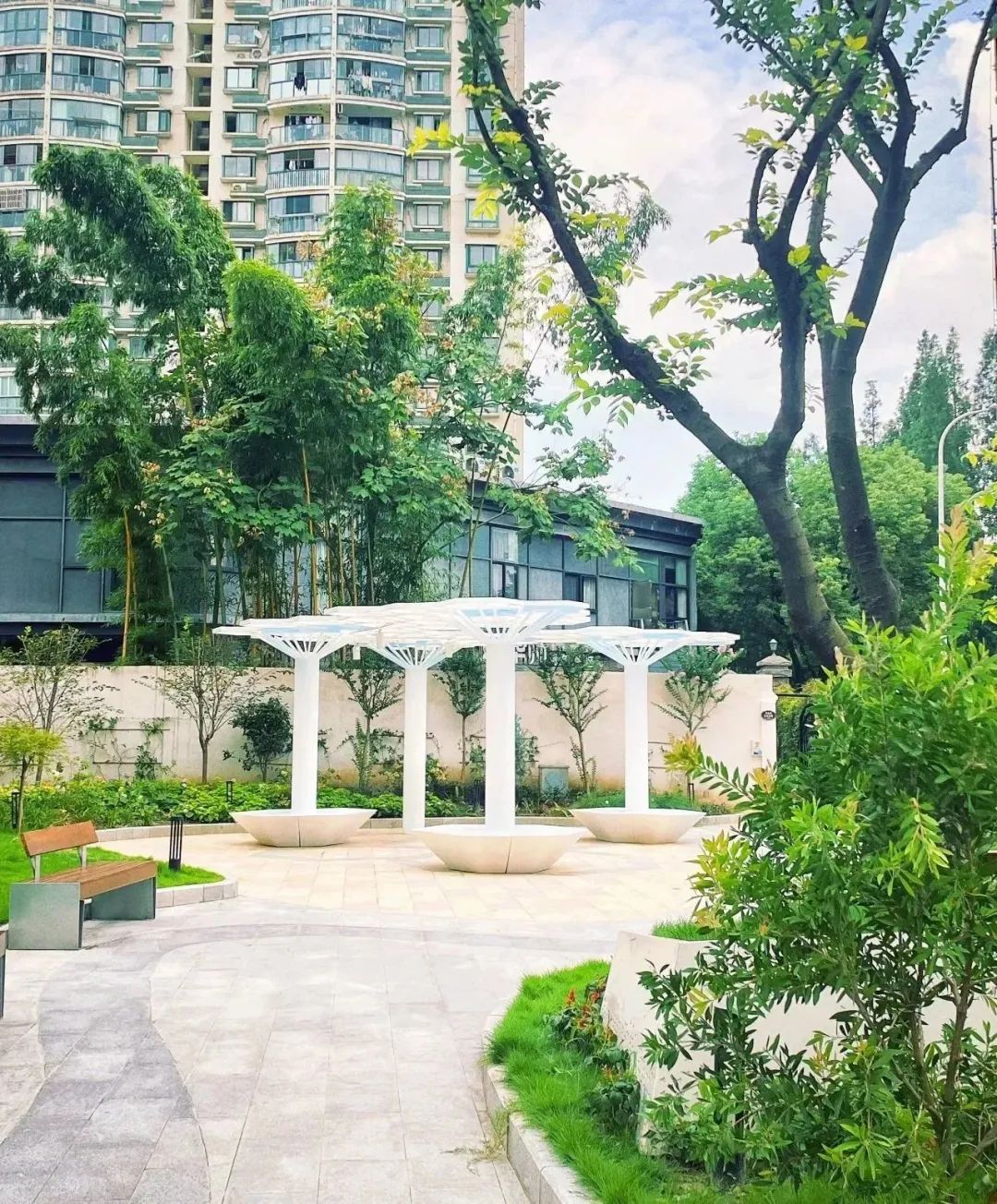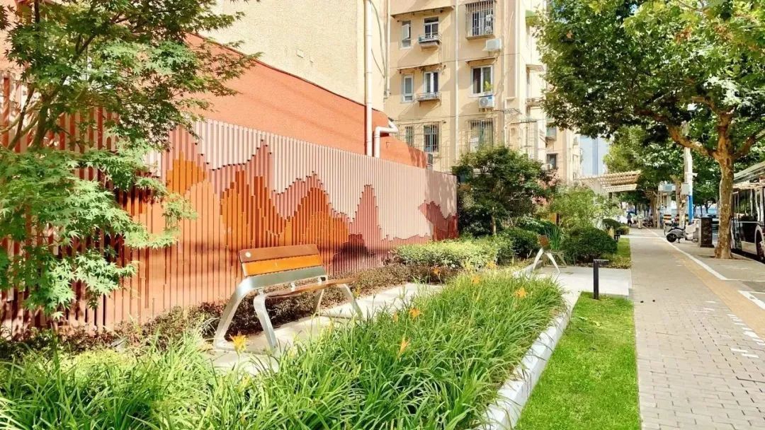 花园以“漫步进花园,闲享慢生活”为设计理念,打造集行人通行、花园休憩、形象展示功能于一体的绿色空间。园内结合自然流线型园路,设有造型廊架、坐憩设施、展示景墙,为市民社交活动提供更舒适的环境。居民游客漫步园内,闲享片刻的安逸。