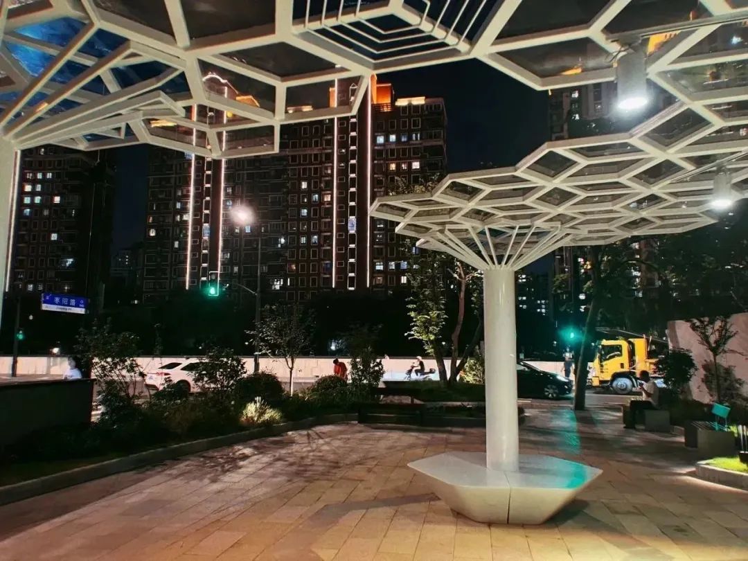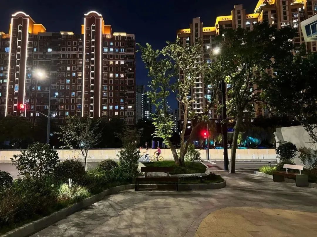 到了夜晚,苏河沿岸的景观照明别有韵味,漫花园也因地制宜,草坪灯、照树灯、景墙灯带的组合柔和内敛,与苏河沿岸灯光动静相宜,相得益彰。