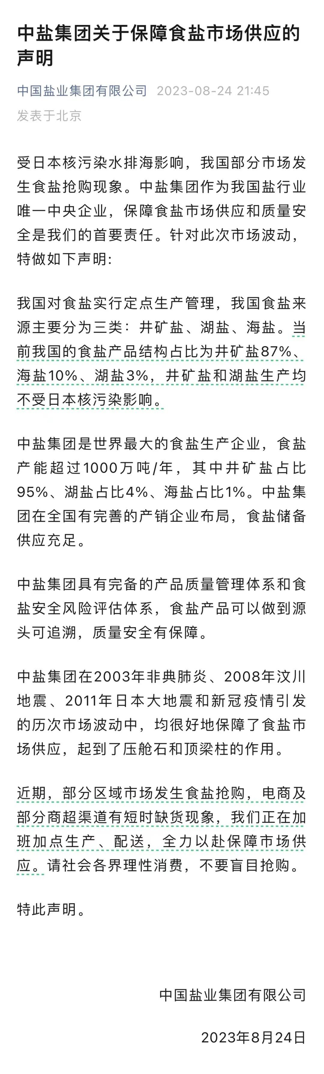 中盐集团24日晚发布声明称,我国对食盐实行定点生产管理,我国食盐来源主要分为三类:井矿盐、湖盐、海盐。当前我国的食盐产品结构占比为井矿盐87%、海盐10%、湖盐3%,井矿盐和湖盐生产均不受日本核污染影响。