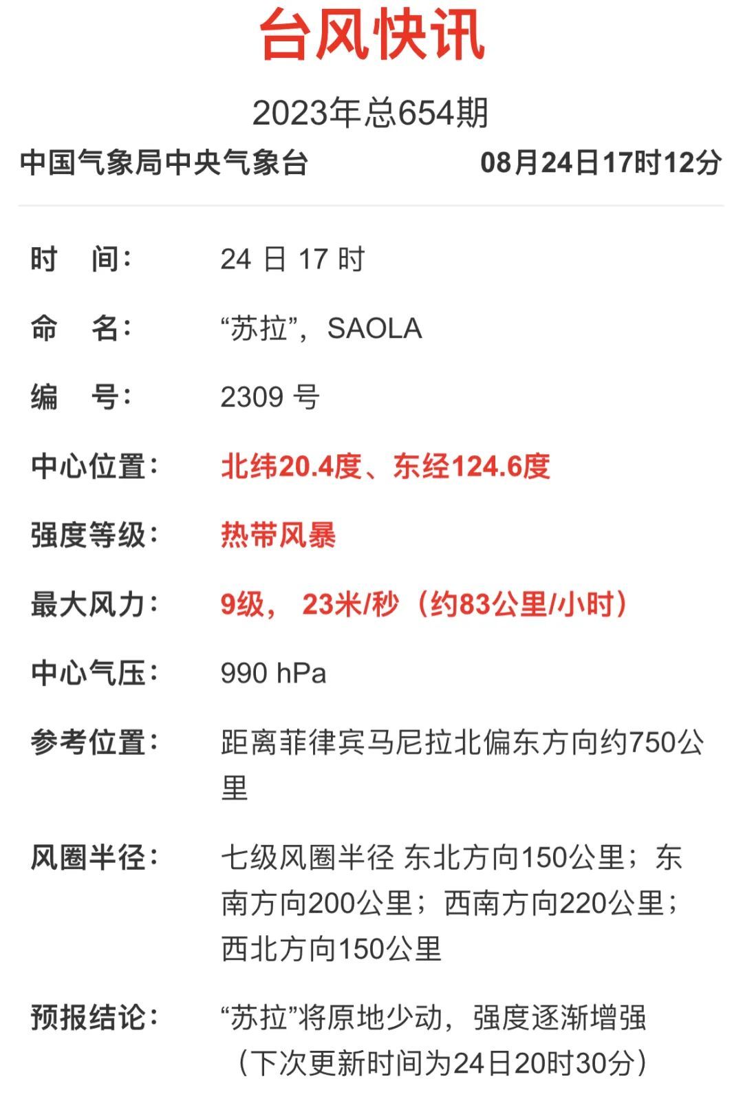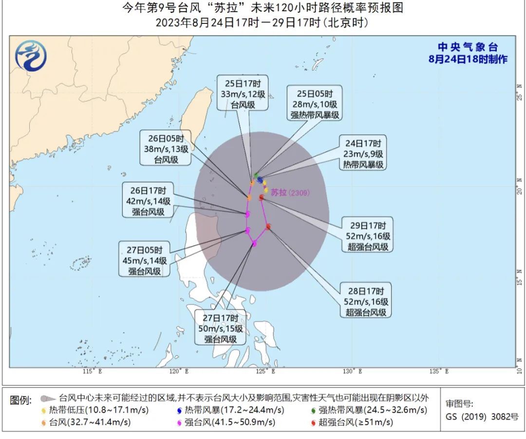 今年第9号台风“苏拉”已于24日下午14时开始编报,其中心位于距离菲律宾马尼拉北偏东方向约750公里的西北太平洋洋面上。预计“苏拉”将先在菲律宾吕宋岛东北部洋面徘徊,29日开始向北偏西方向移动,逐渐向台湾东部沿海靠近,最强可达强台风级或超强台风级。未来路径有较大不确定性,市气象服务中心将严密监视,及时更新预报。